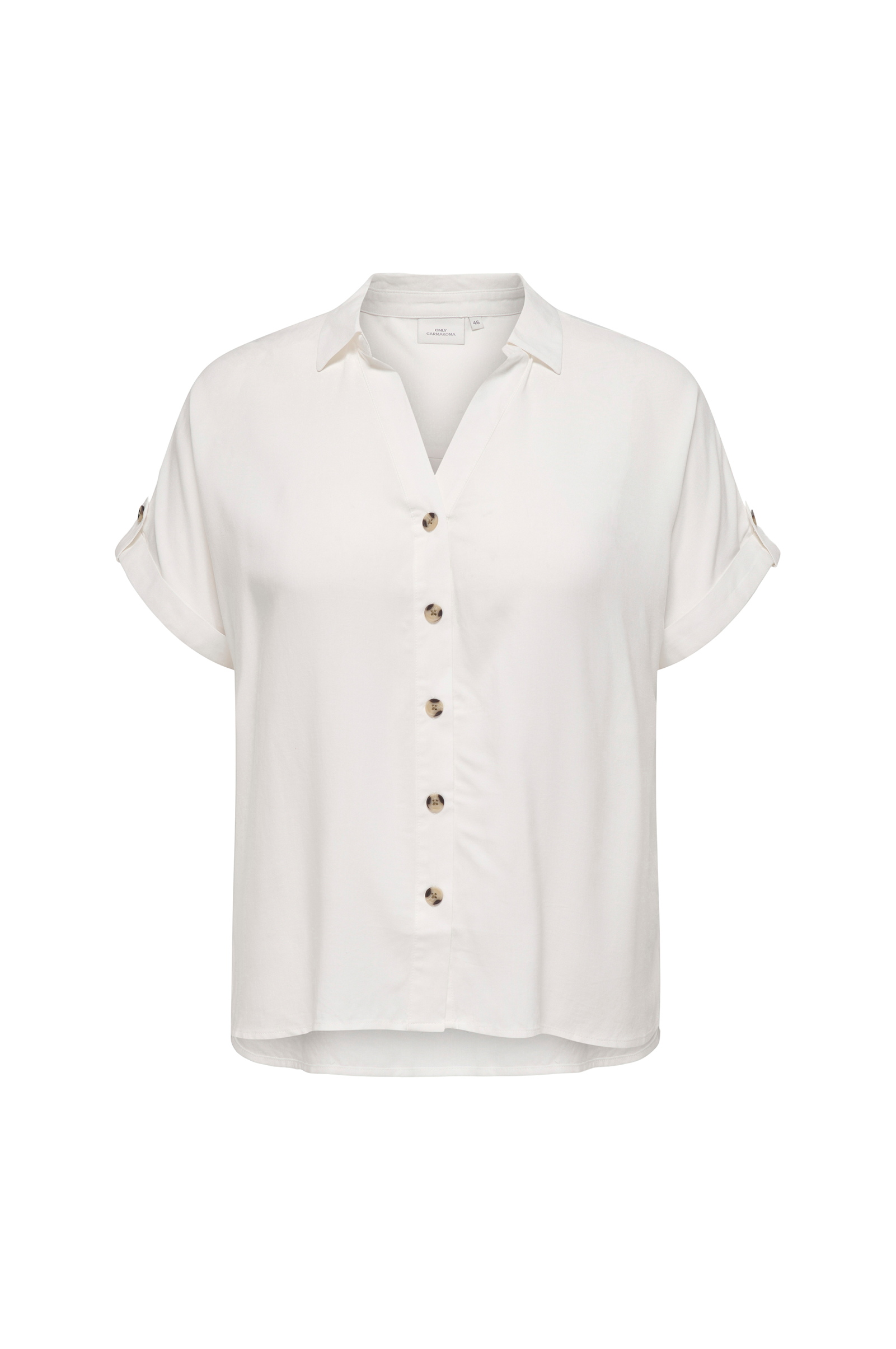 • Skjorte i viskose• Krave• V-udskæring• Korte ærmer• Syede ærmeafslutninger• Knaplukning foran• Lidt længere bagside• Plusstørrelser