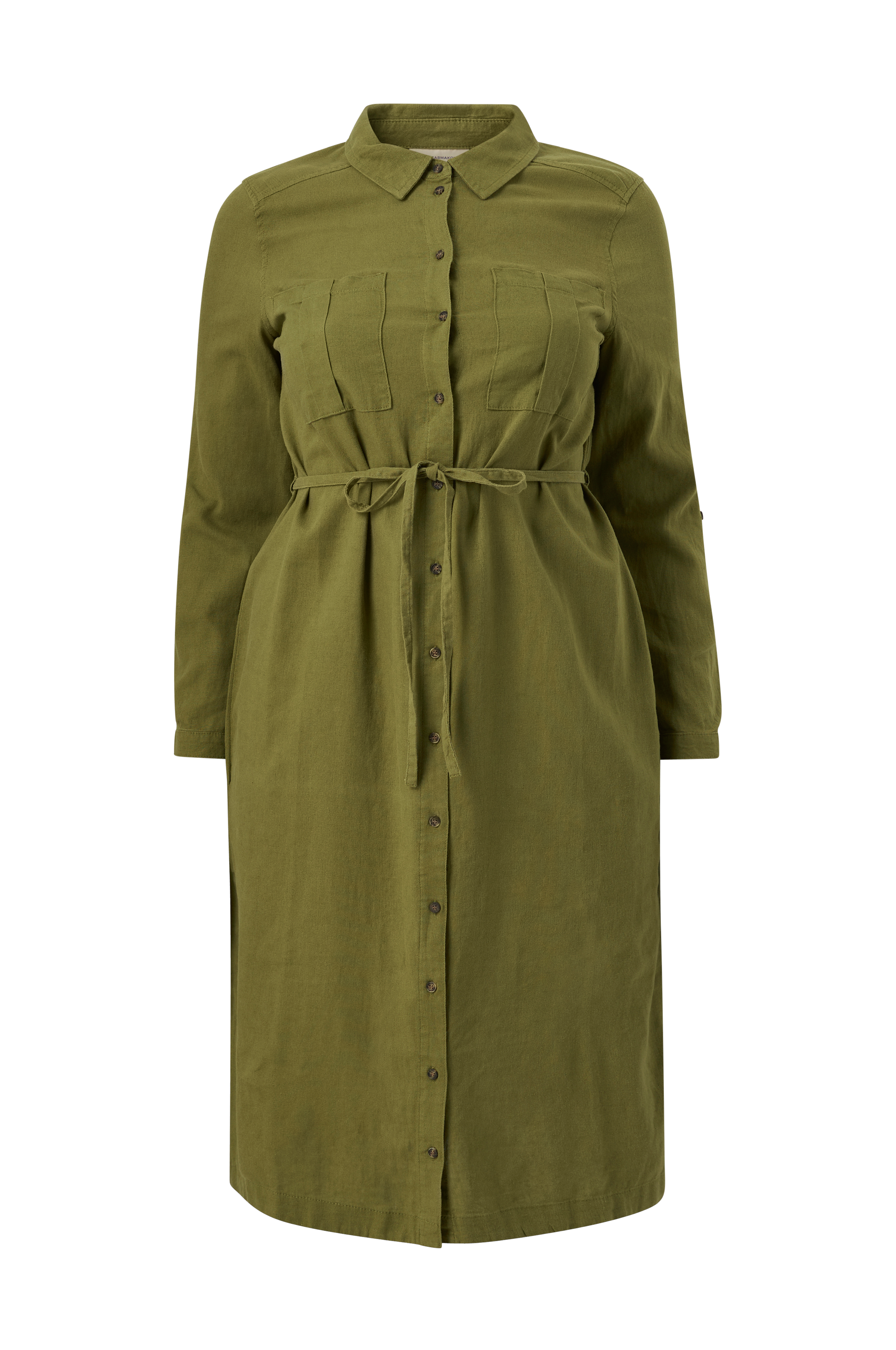 • Kjole i hørblanding• Knapper oppe foran• Lange ærmer med knap til oprulning• To brystlommer• Bindebånd ved taljen• Slidser i siderne• Store størrelser• Længde: 116 cm i størrelse 42