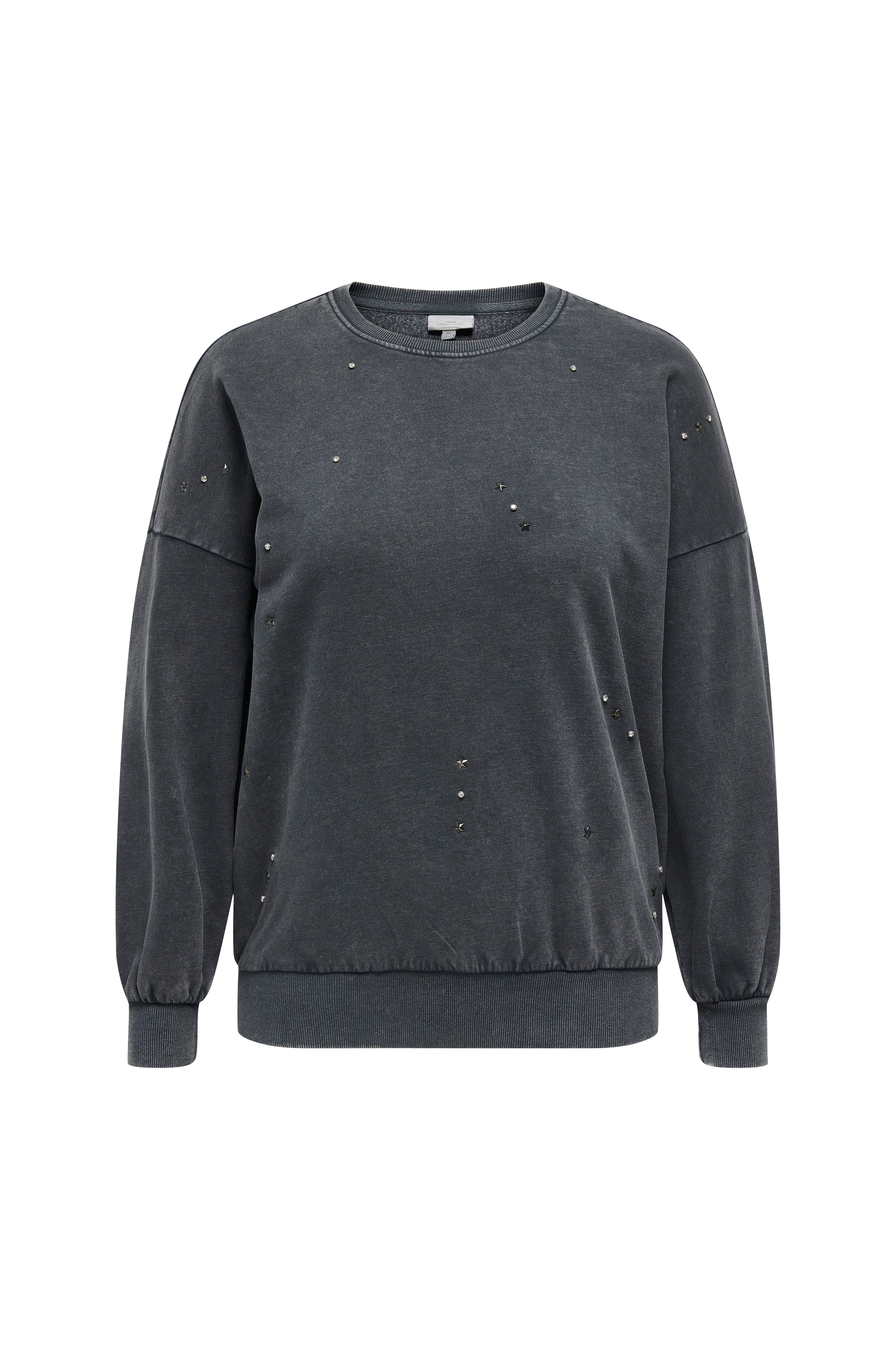 • Store størrelser• Uformel model med broderet rhinsten og nitter foran• Halsudskæring med ribkant• Nedsænket skulder• Ribmanchet ved manchetterne og nederst