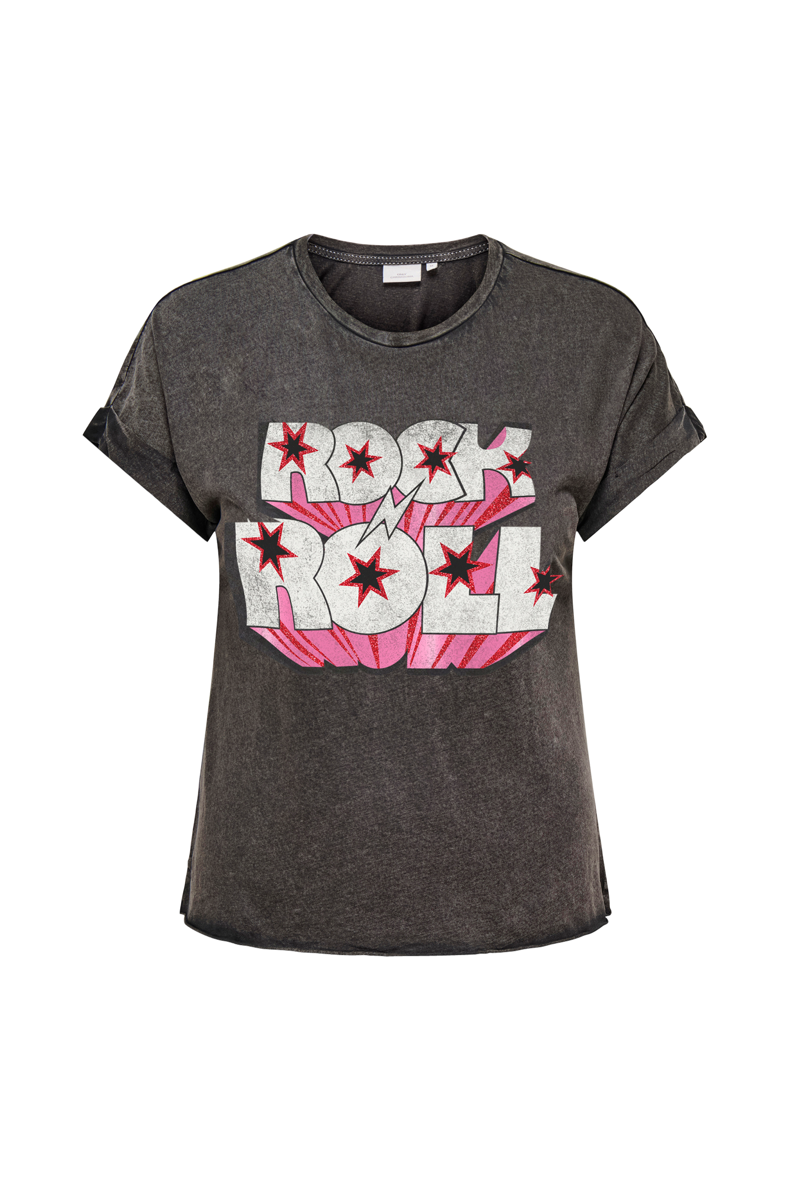 • Vintage vasket t-shirt i bomuld• Rund halsudskæring• Tryk med glitter foran• Syede ærmeafslutninger• Rå søm• Plusstørrelser