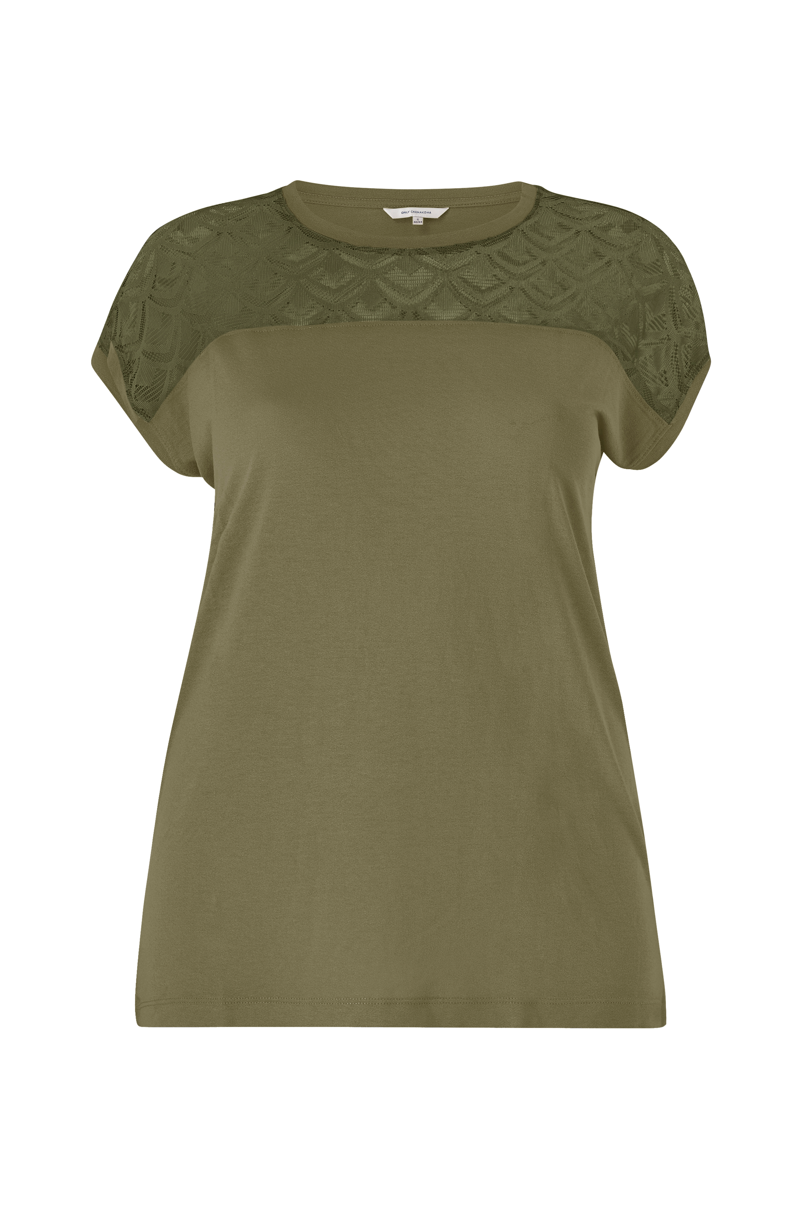 Top carFlake S/S Mix Top Noos fra Only Carmakoma. Kort ærme med ribkant og rund hals med ribkant. Gennembrudt blonde foroven foran.