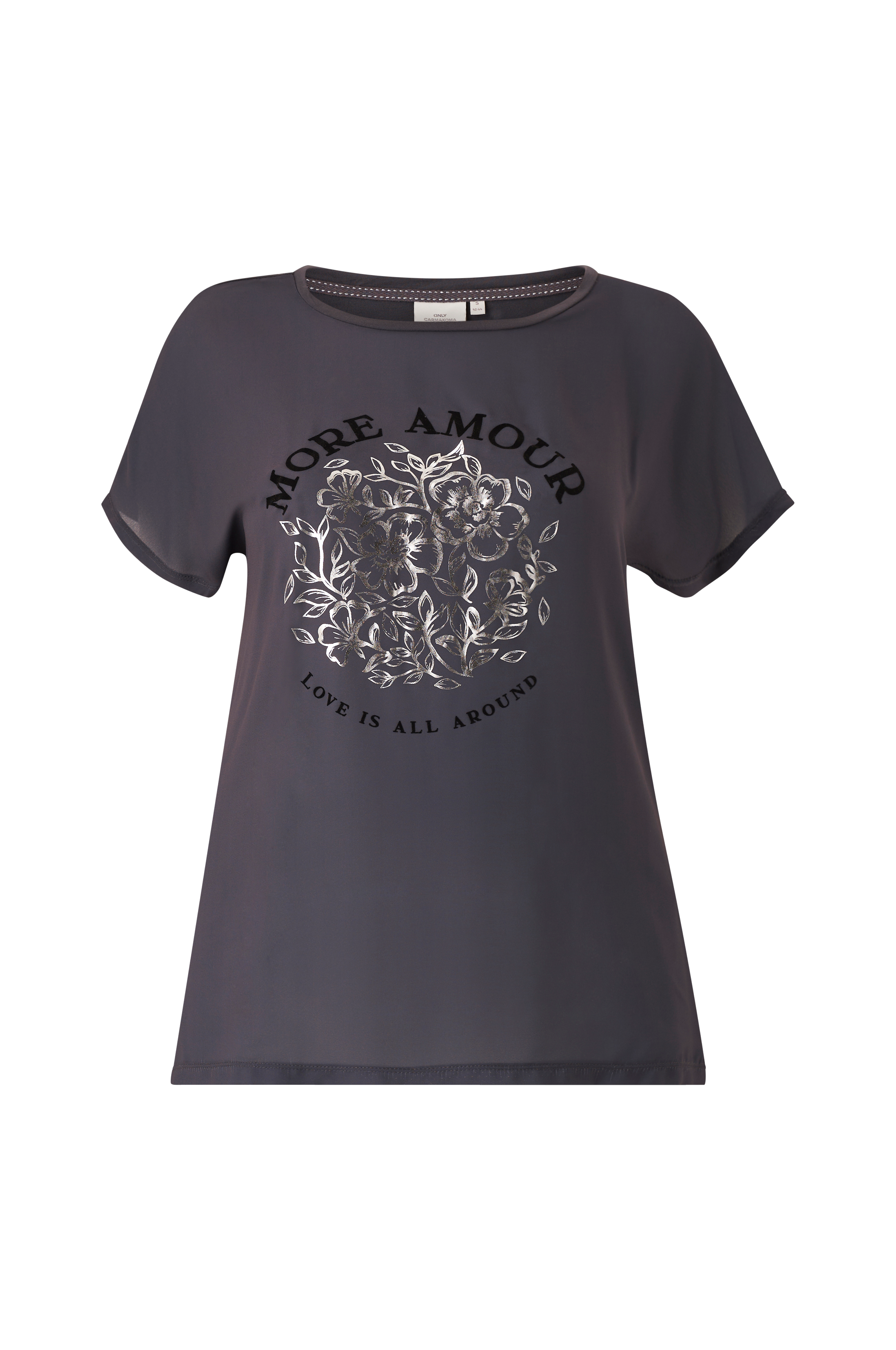 • Store størrelser• Lige model• Bagside i jersey• Bred halsudskæring med tynd ribkant• Nedsænket skulder med kort ærme• Sølvagtigt, velouragtigt tryk foran