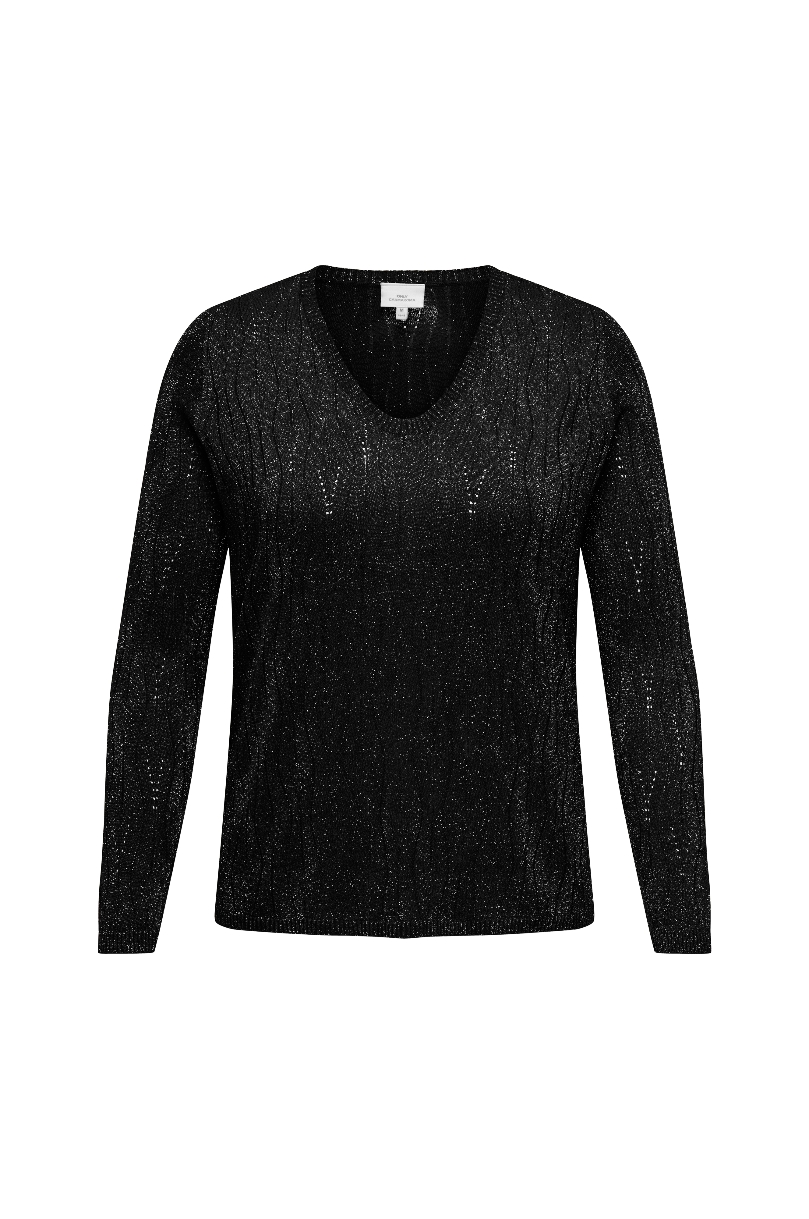 • Store størrelser• Mønsterstrikket model med glitter• V-formet halsudskæring• Langt ærme• Ribstrikkede kanter