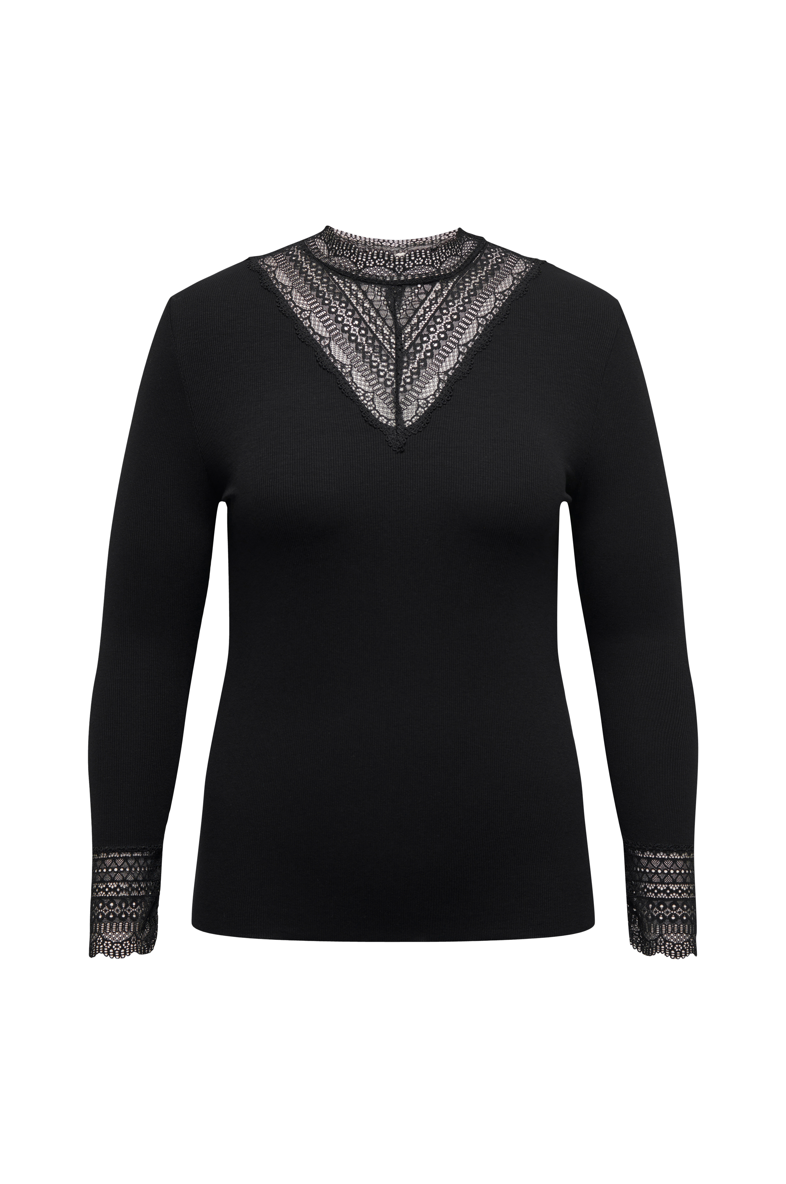 • Store størrelser• Ribbet model• V-formet blondeindlæg oppe foran og bagpå med lille opretstående krave• Langt ærme med blonde ved ærmeafslutningerne