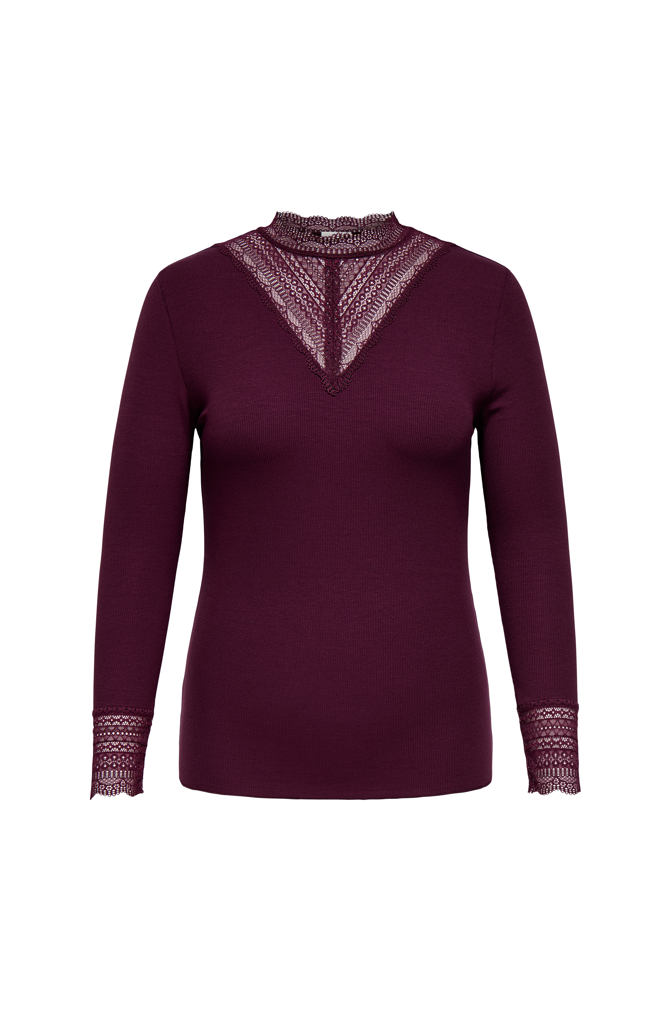 • Store størrelser• Ribbet model• V-formet blondeindlæg oppe foran og bagpå med lille opretstående krave• Langt ærme med blonde ved ærmeafslutningerne