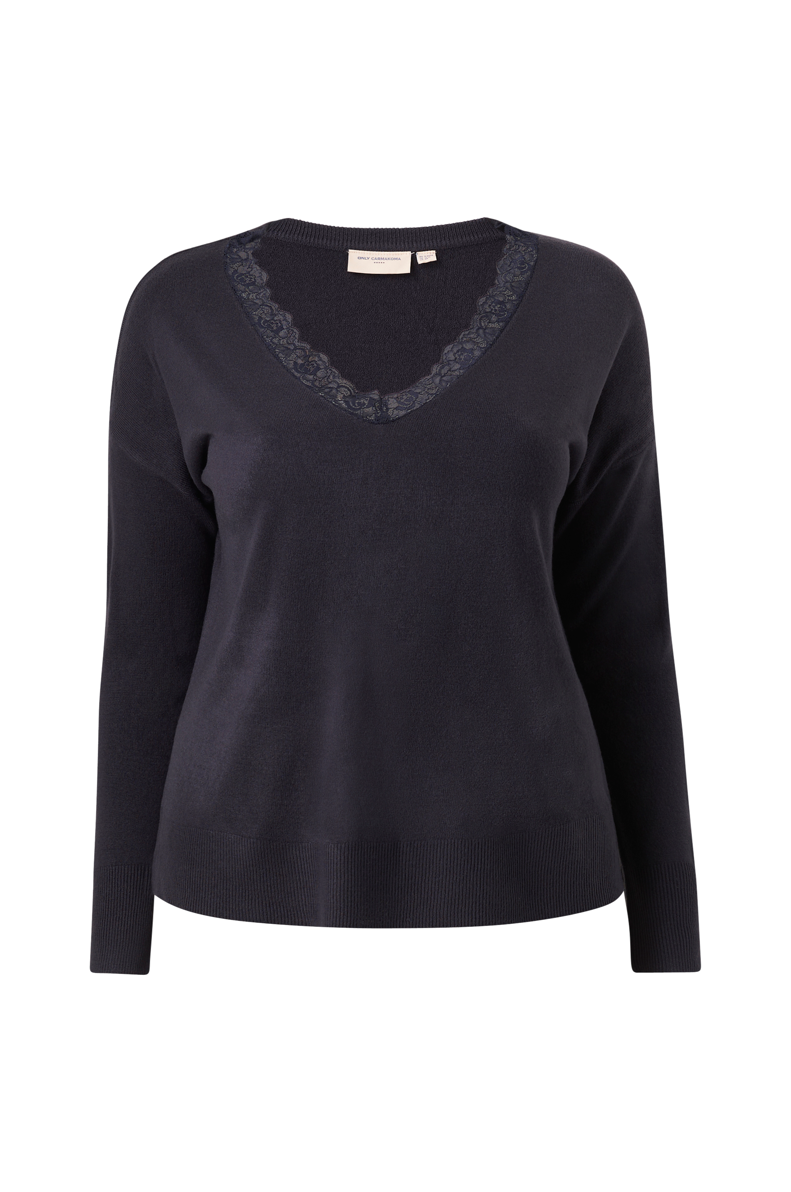 • Fintstrikket trøje• V-udskæring med blonde• Nedsænkede aksler• Store størrelser