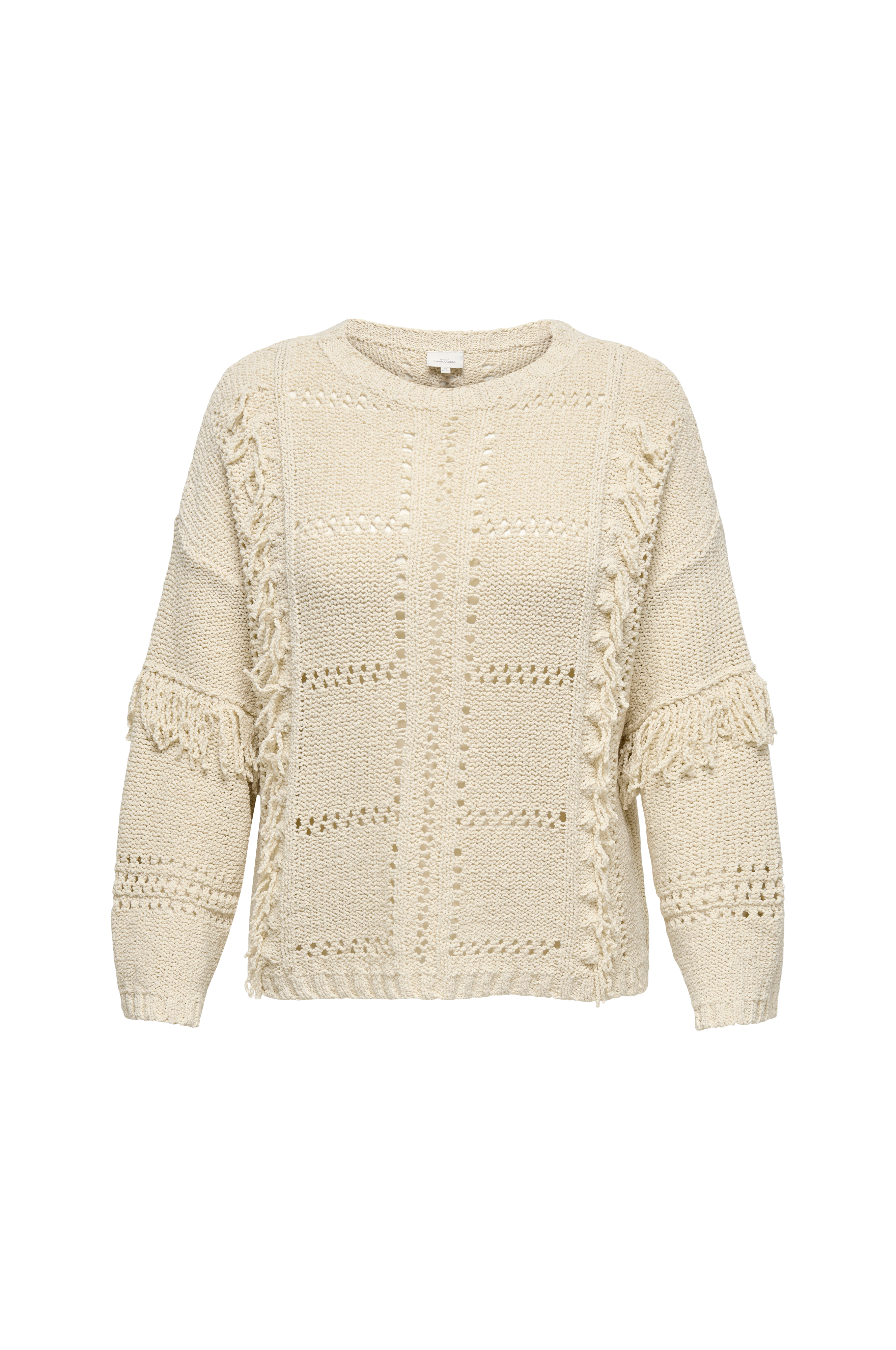 • Store størrelser• Lige, mønsterstrikket model med små frynser• Halsudskæring med ribkant• Nedsænket skulder• Langt, lige ærme