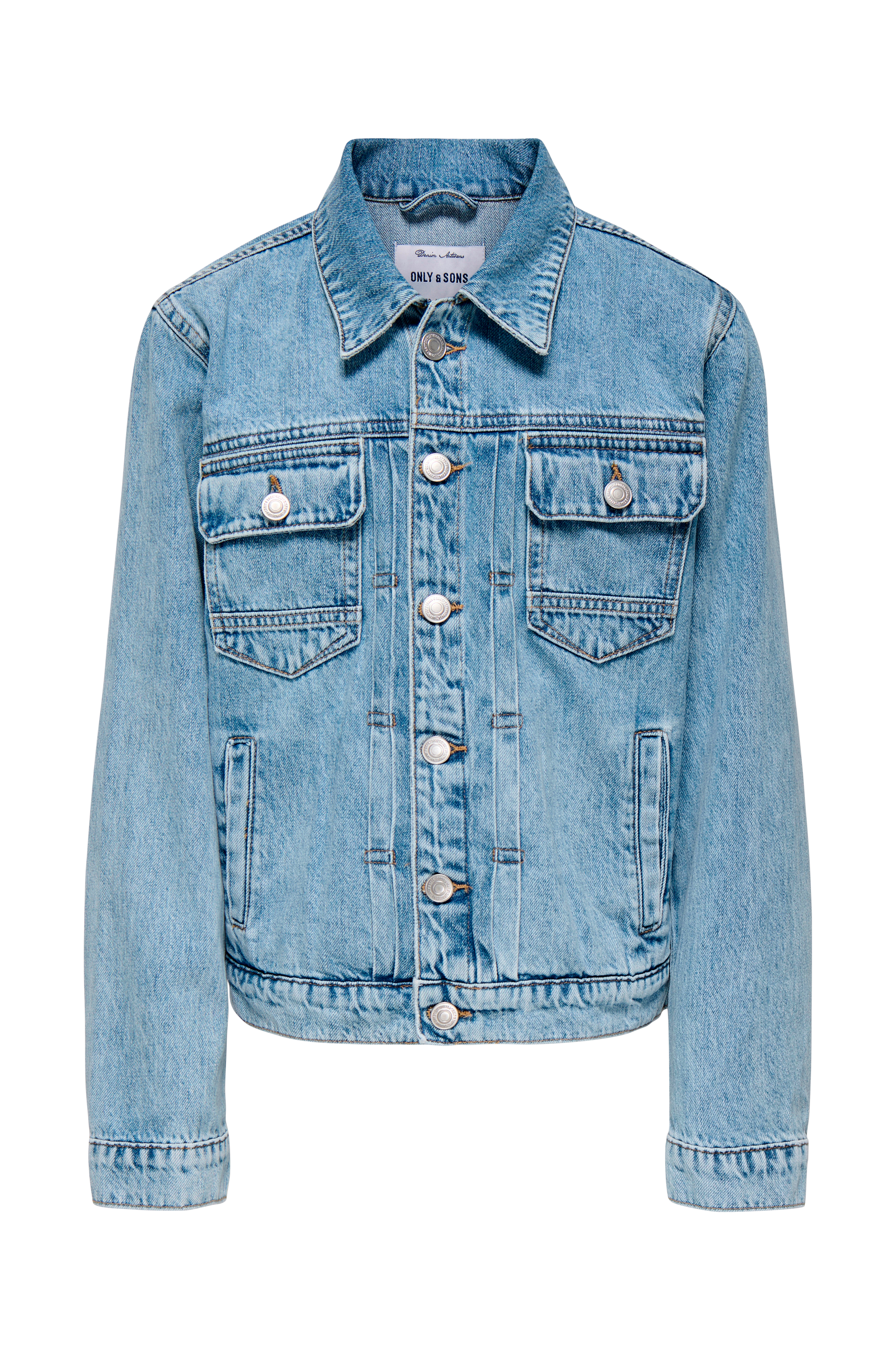 • Jakke i denim• Krave• Slids med knap ved manchetterne• Knaplukning• To brystlommer med låg• Sidelommer