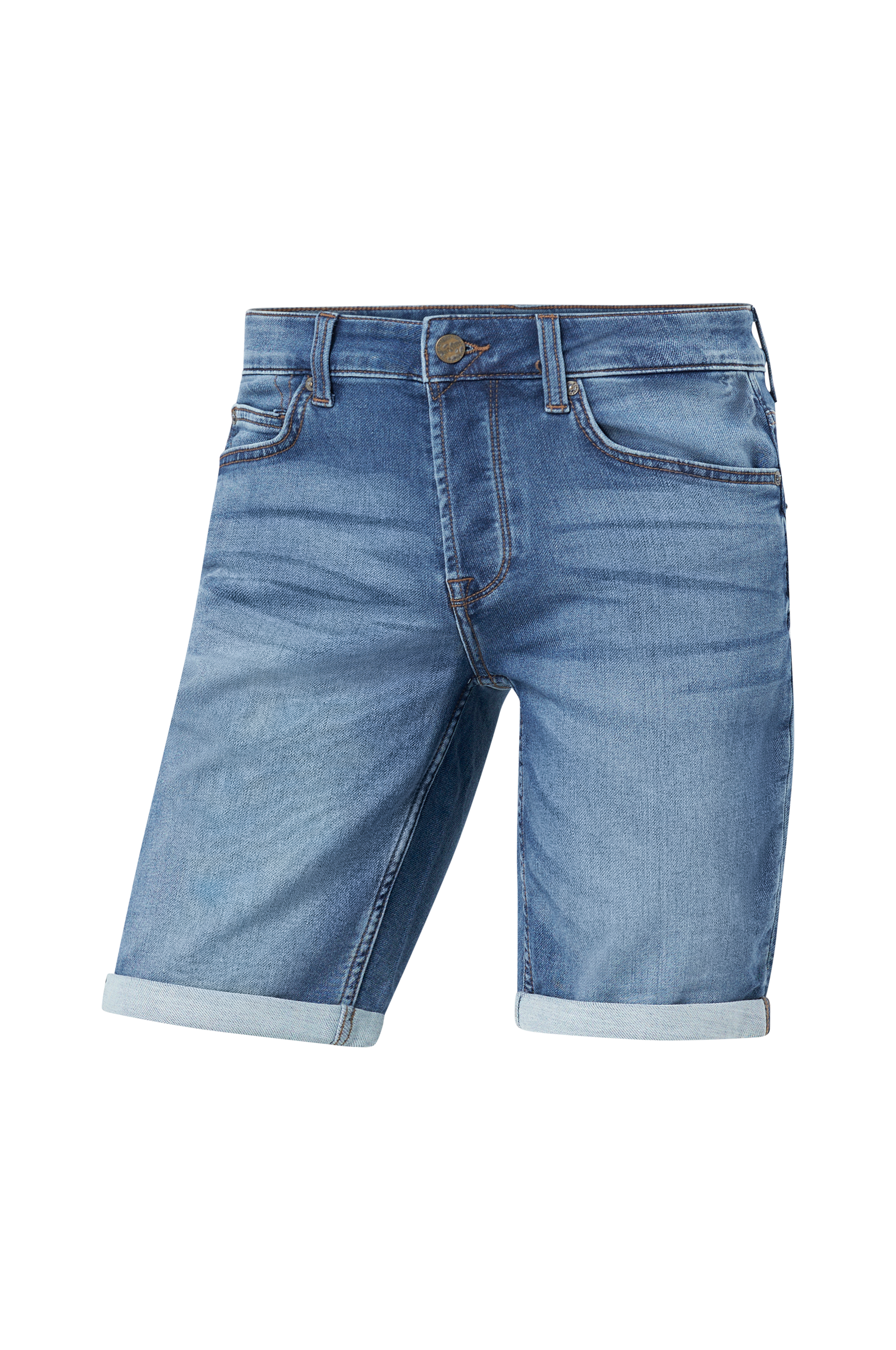 Denimshorts i stretchdenim med lige ben. 5-lommemodel med knapgylp. Opsyet benkant.