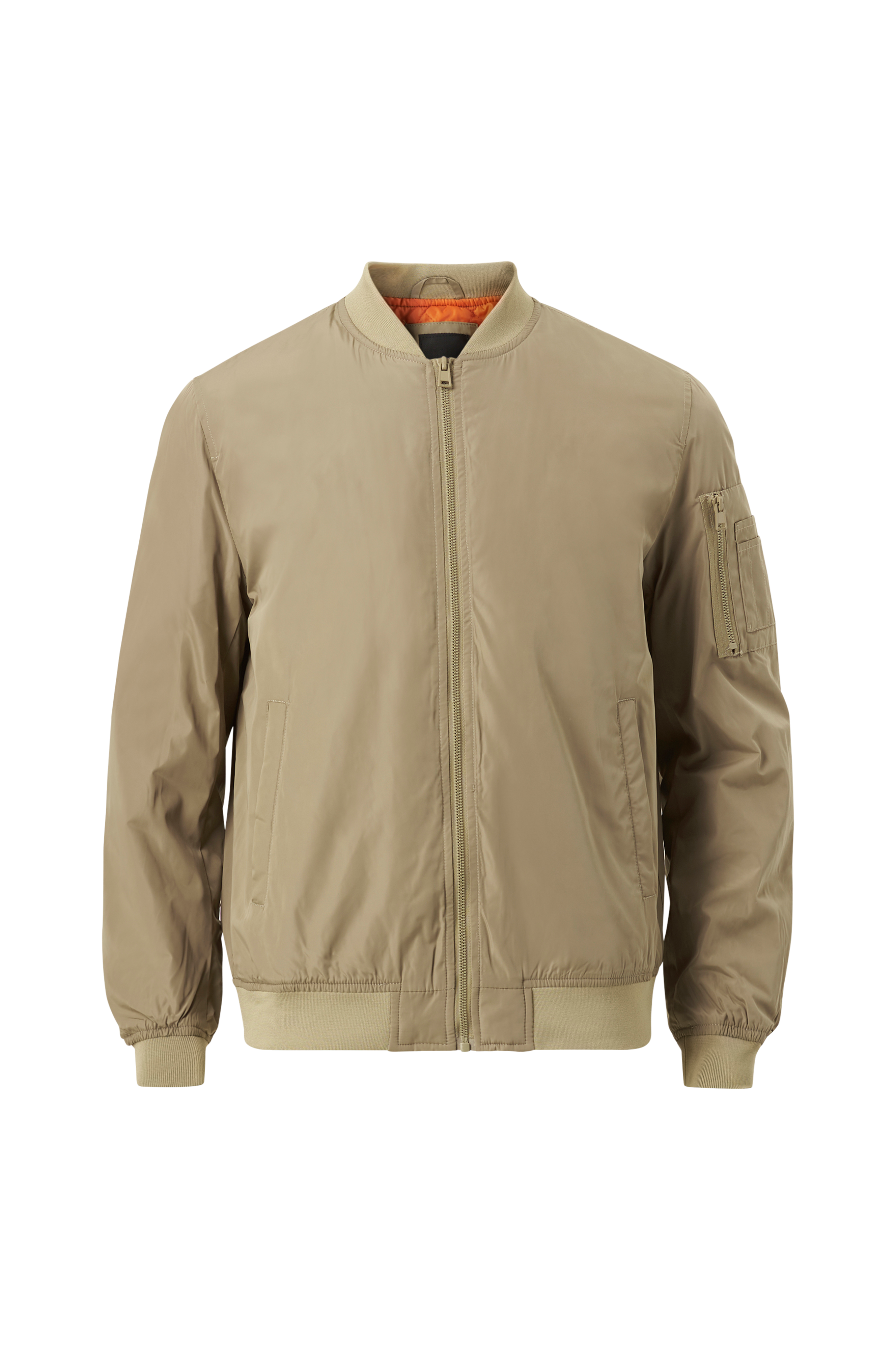 Let vatteret bomberjakke med krave i rib. Lynlås. To lommer forneden og en lomme på ærmet med lynlås. En inderlomme. Ribkant i ærmekant og forneden. Længde ca. 67 cm i str. M.