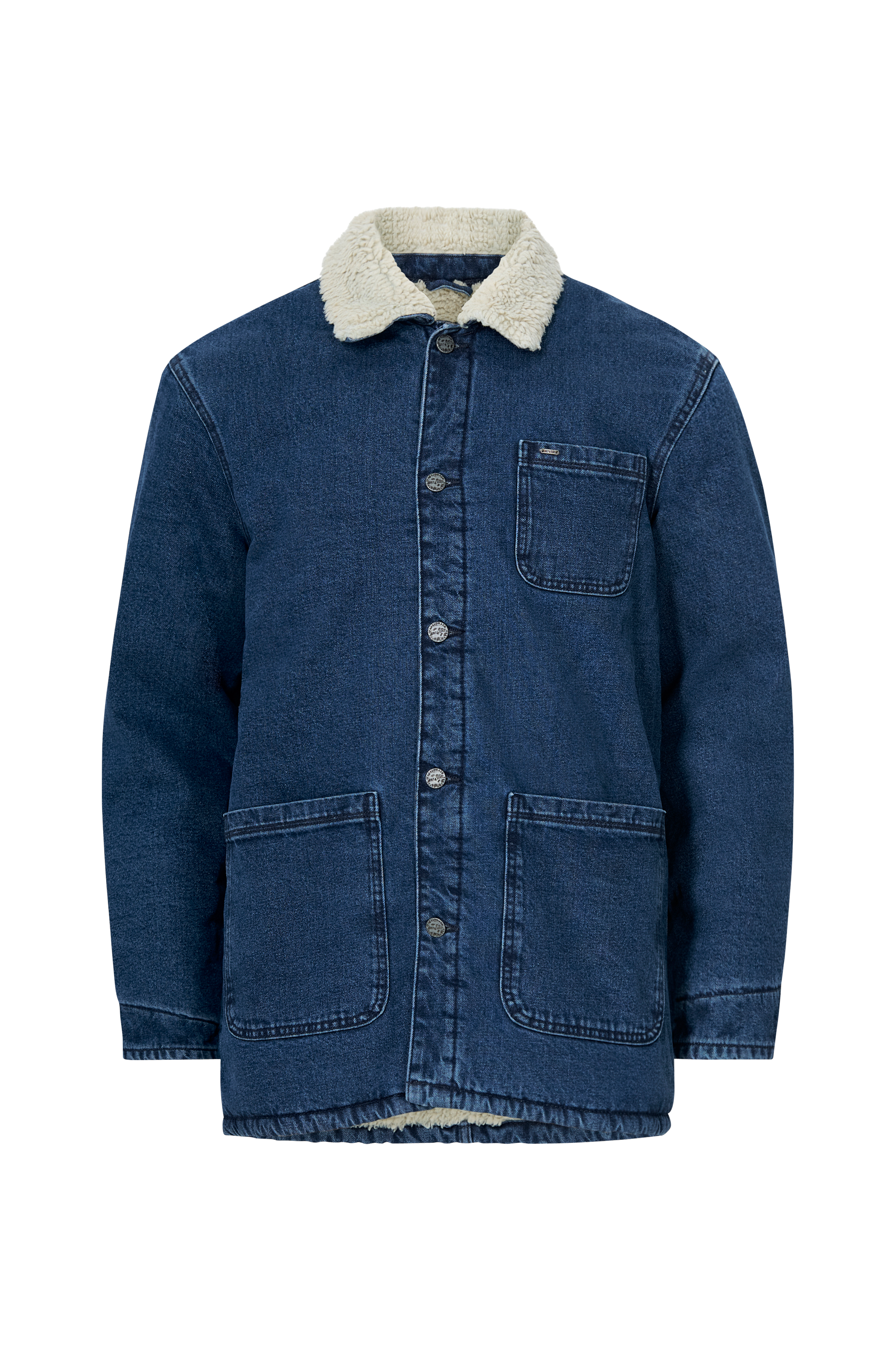 Denimjakke i klassisk model med for og krave i plys. Vævet, vatteret for i ærmerne. To lommer forneden og en brystlomme. Længde ca. 81 cm i str. M.