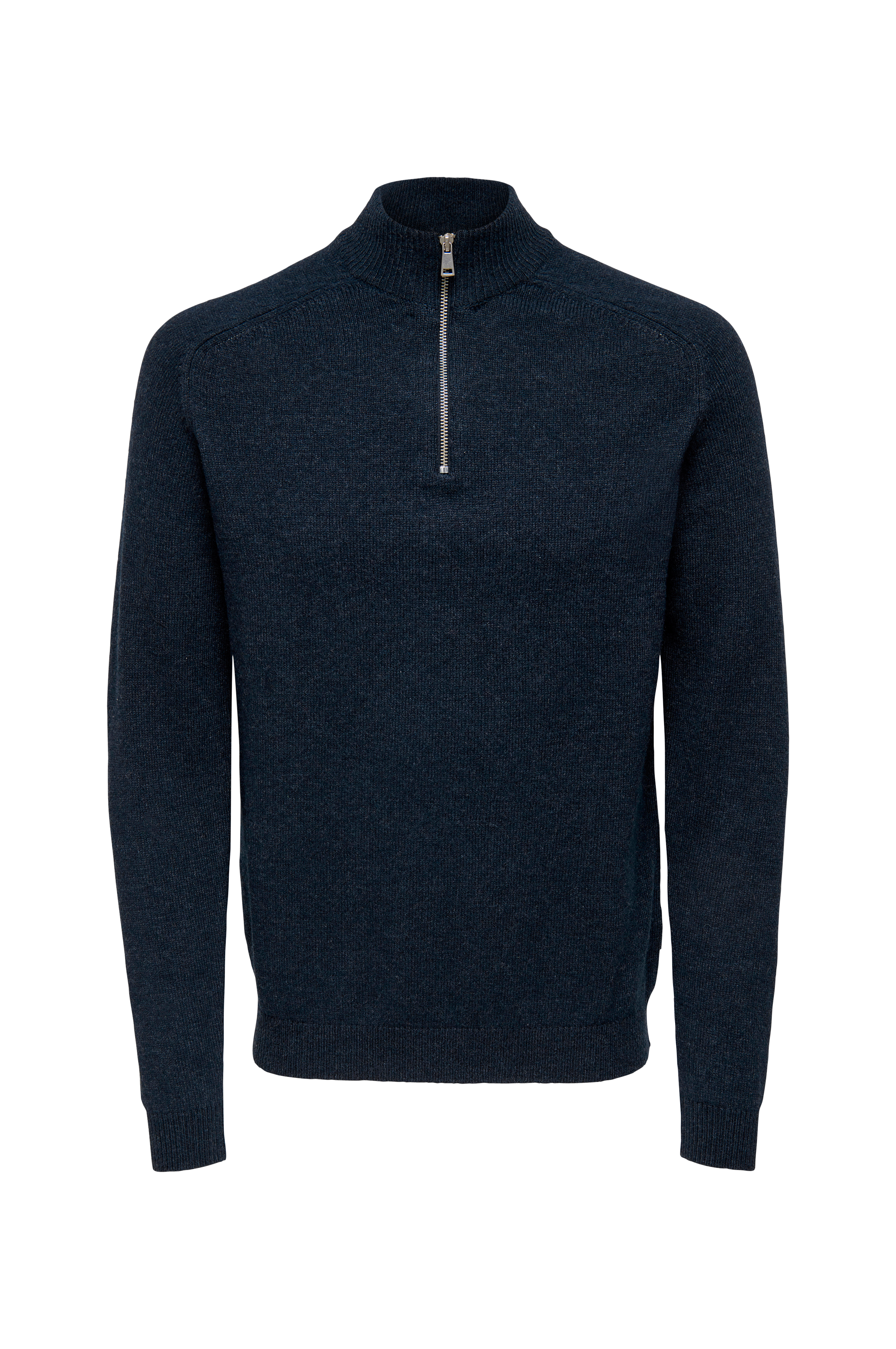 • Strikket trøje i uldblanding• Høj, ribbet krave• Kort lynlås• Raglanærmer• Ribstrikkede kanter ved manchetterne og nederst