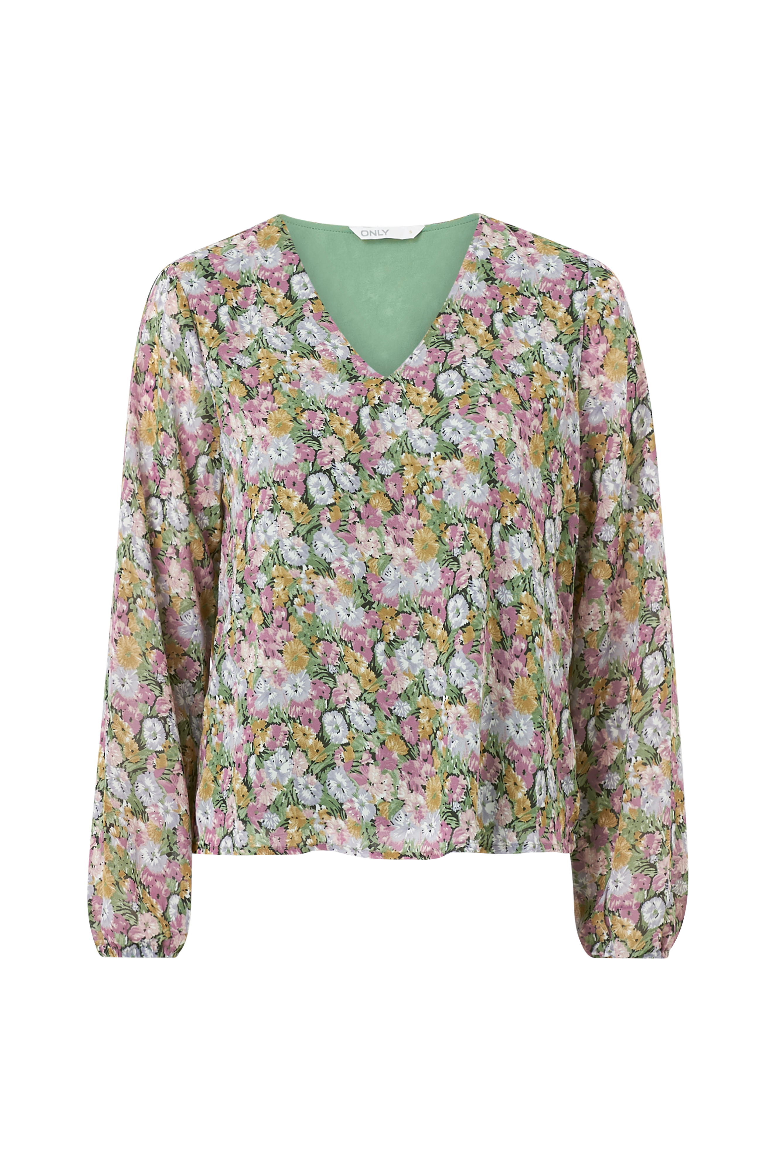 Blomstret bluse i vævet, halvtransparent kvalitet med polyesterfor. Ærmerne er uforede. V-formet halsudskæring og elastik i ærmekant.