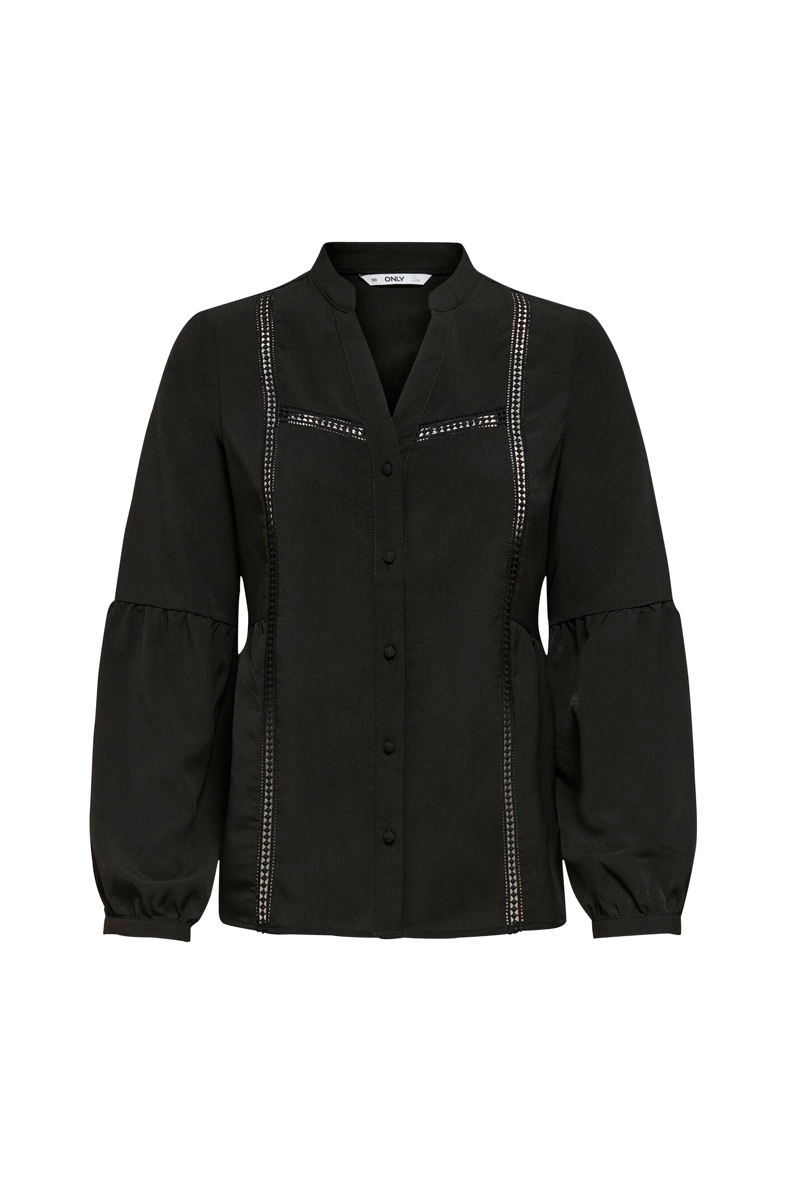Bluse onlEva Life L/S Lace Insert Top Wvn fra Only med V-udskæring og betrukne knapper foran. I vævet kvalitet med hæklet hulbroderi foran. Lange ærmer med balloneffekt og manchet. Rynket søm i taljen bagpå.