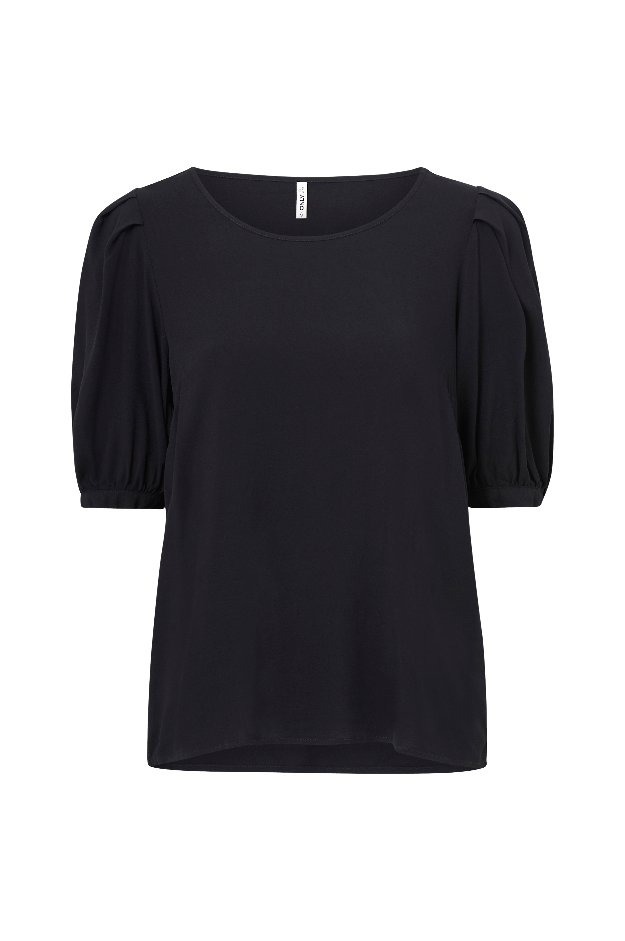 Bluse i blød, vævet viskoskvalitet med rund halsudskæring. Halvlang ærme med puf ved skulderen og knap i ærmekant.