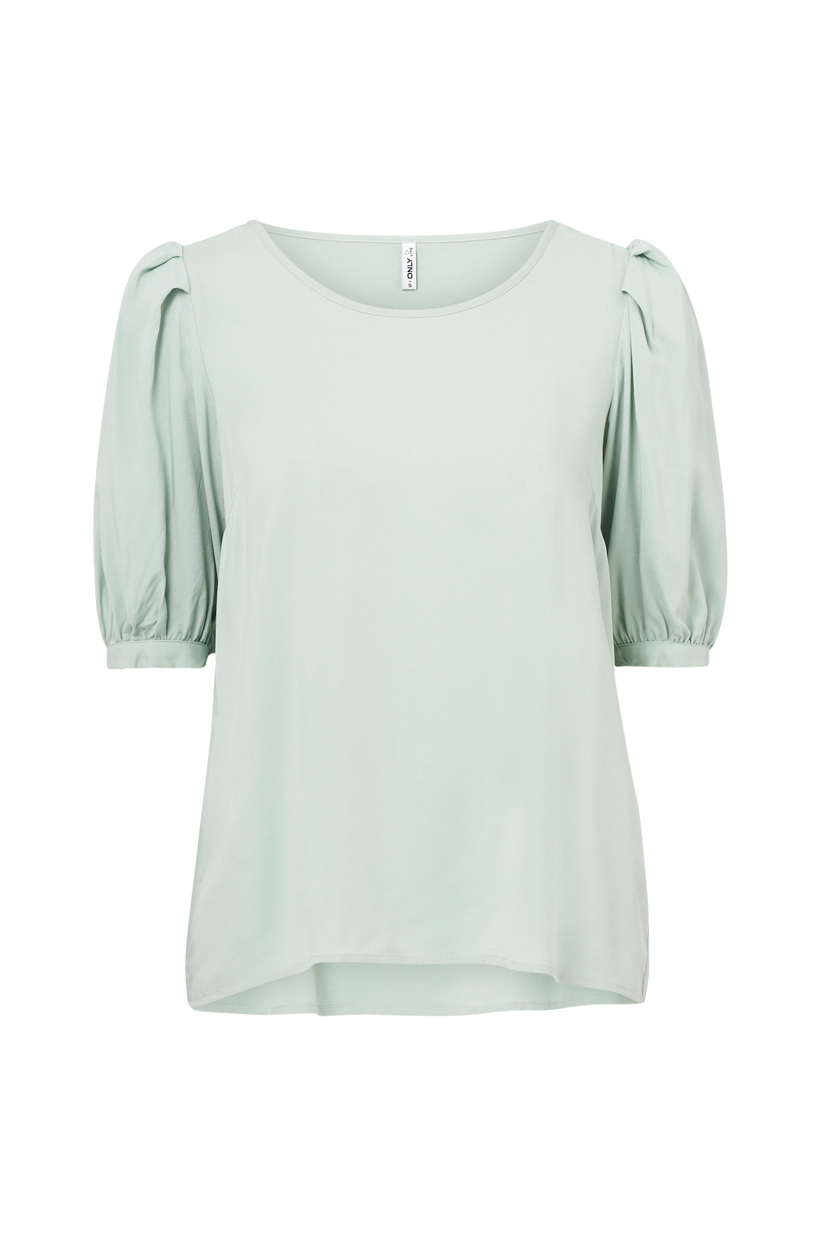 Bluse i blød, vævet viskoskvalitet med rund halsudskæring. Halvlang ærme med puf ved skulderen og knap i ærmekant.