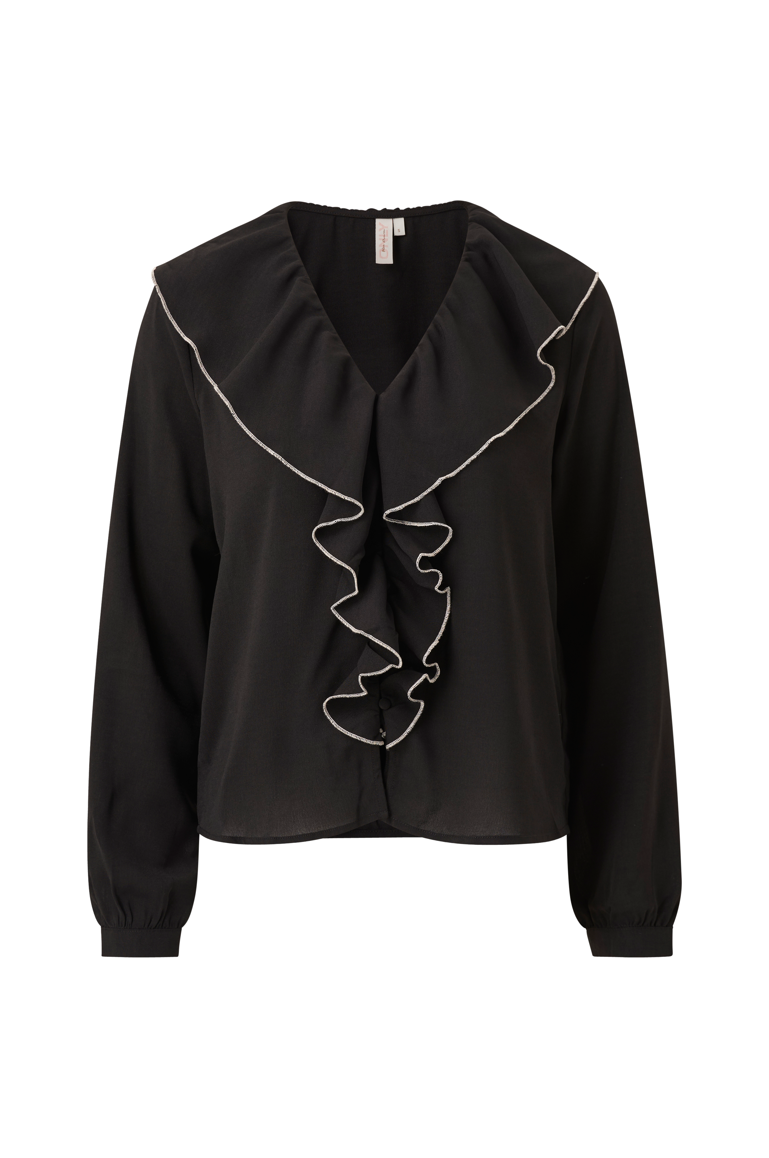 • V-udskæring med volant• Beklædte knapper foran• Tynd manchet ved manchetterne