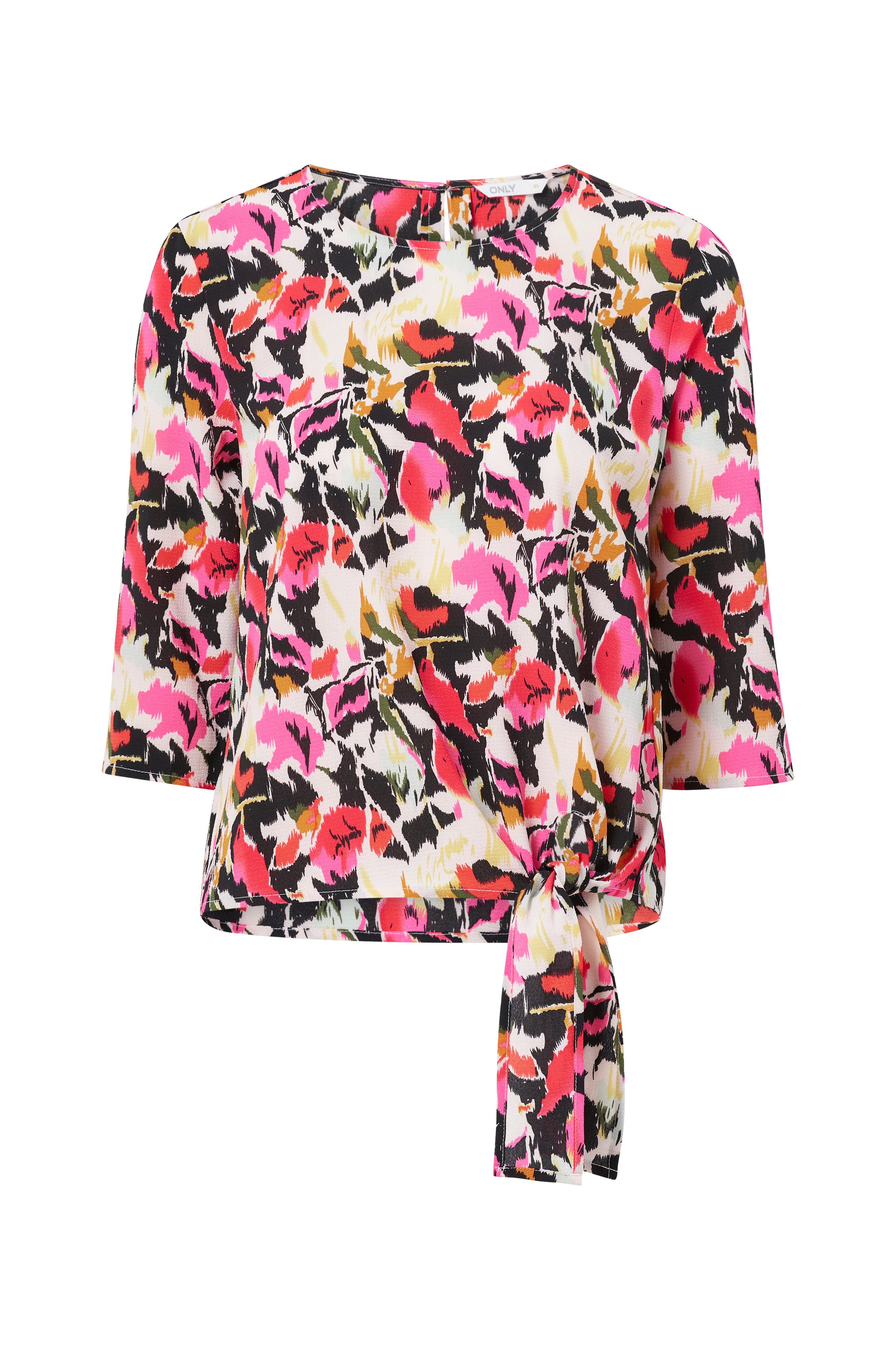 Mønstret bluse i vævet, crepet kvalitet. 3/4-lange ærmer og rund hals med slids og knap bagpå. Bindebånd i kanten forneden foran.