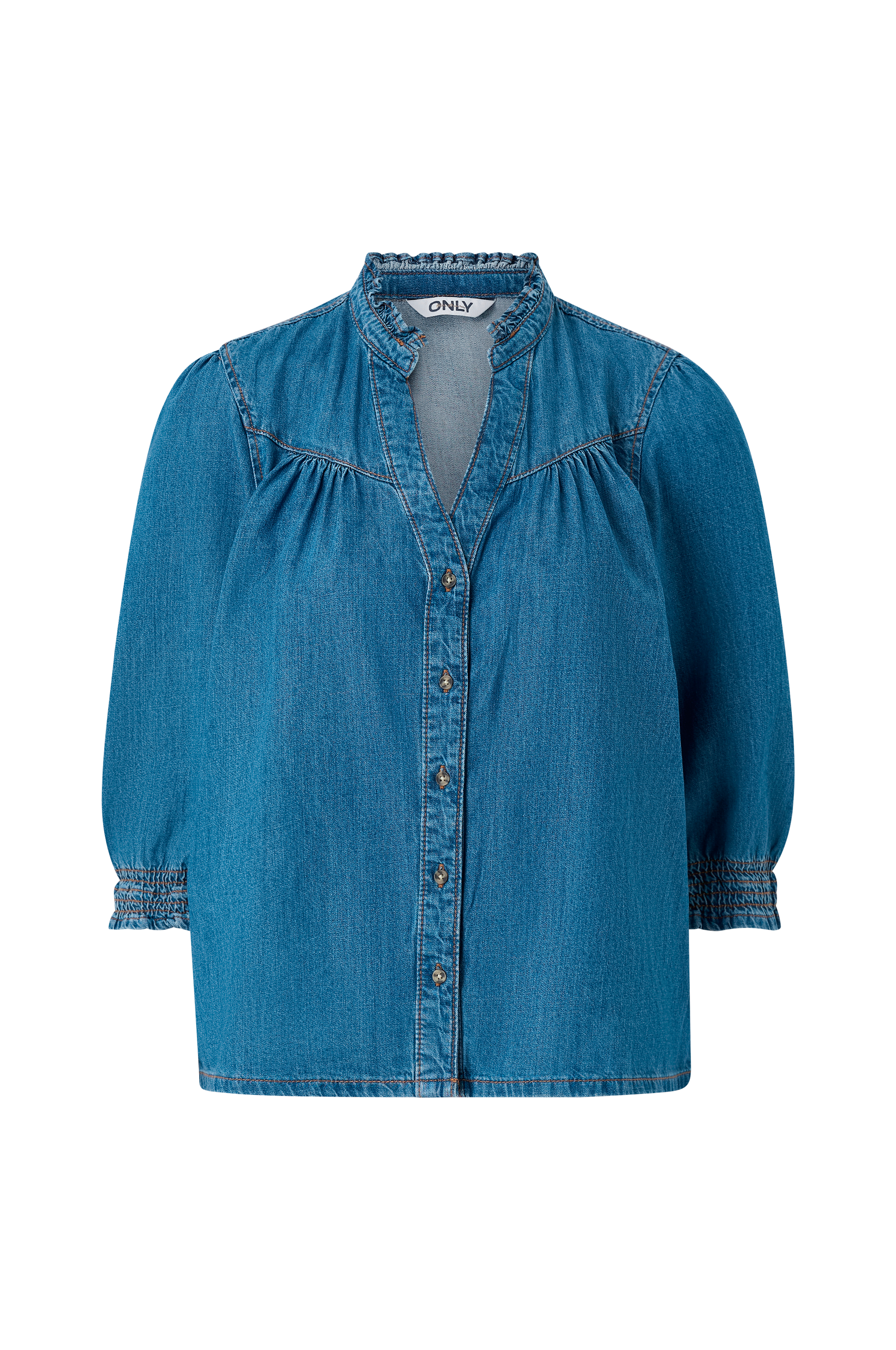 • Bluse i bomuldsdenim• V-formet halsudskæring med flæsekant på toppen• Sømdetalje ved brystet med samling nederst• Knapstolpe foran• Halvlange pufærmer med smock ved manchetterne