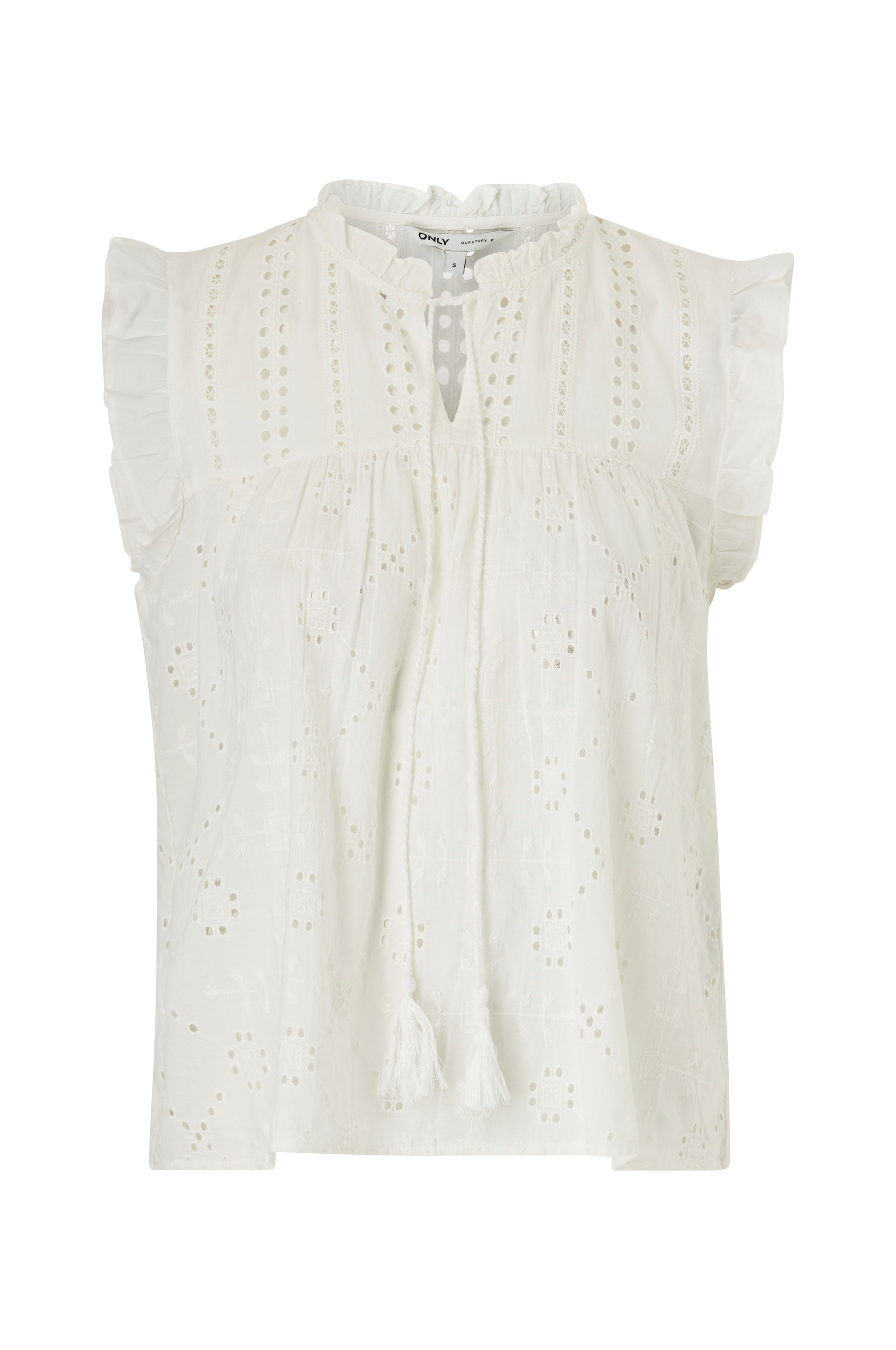 • Model med hulbroderi• Rund hals med volant og langt bindebånd foran• Lille volant omkring ærmeåbningerne