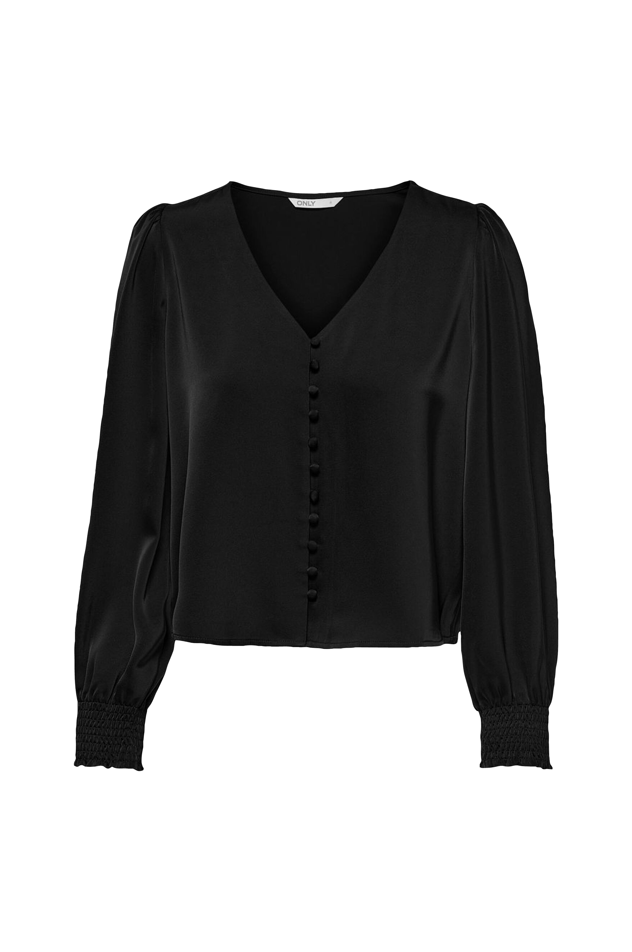 • Kort, firkantet model• V-udskæring• Stofbetrukkede knapper foran• Lange ærmer med smock ved manchetterne• Rynket skuldersøm• Vævet kvalitet med glans