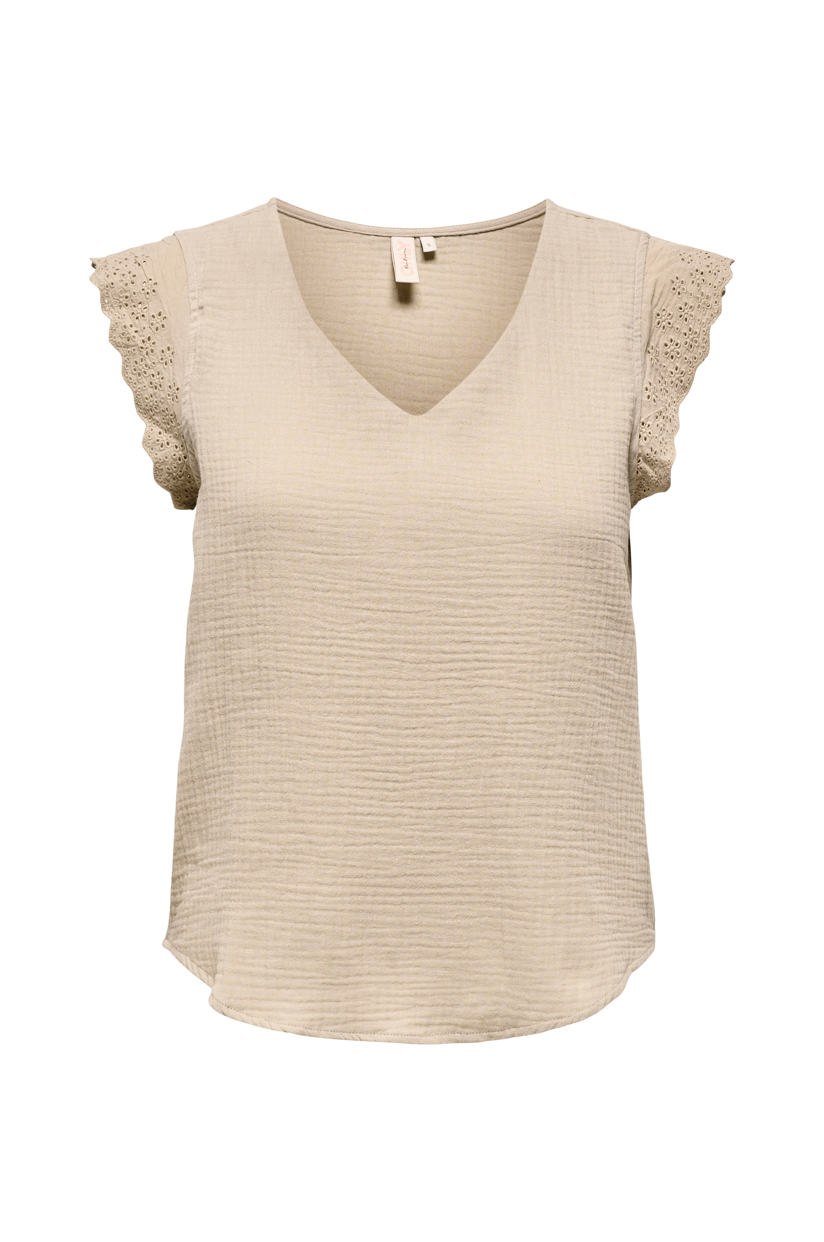 • V-udskæring• Korte flagrende ærmer med broderet hulmønster• Behandlet bomuldskvalitet