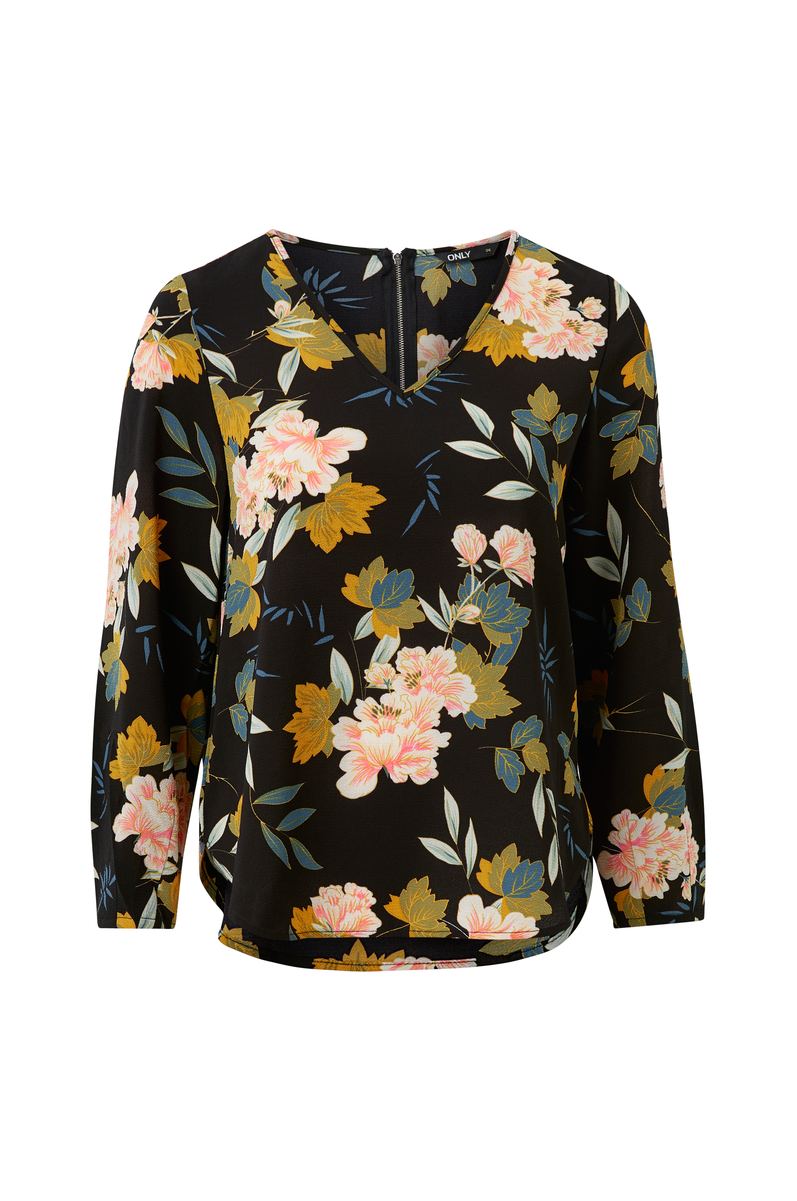 Bluse onlVic LS Aop V Neck Top Wvn fra Only med V-udskæring foran, lynlås bagpå og noget kortere ærmer. I vævet, crepet kvalitet.