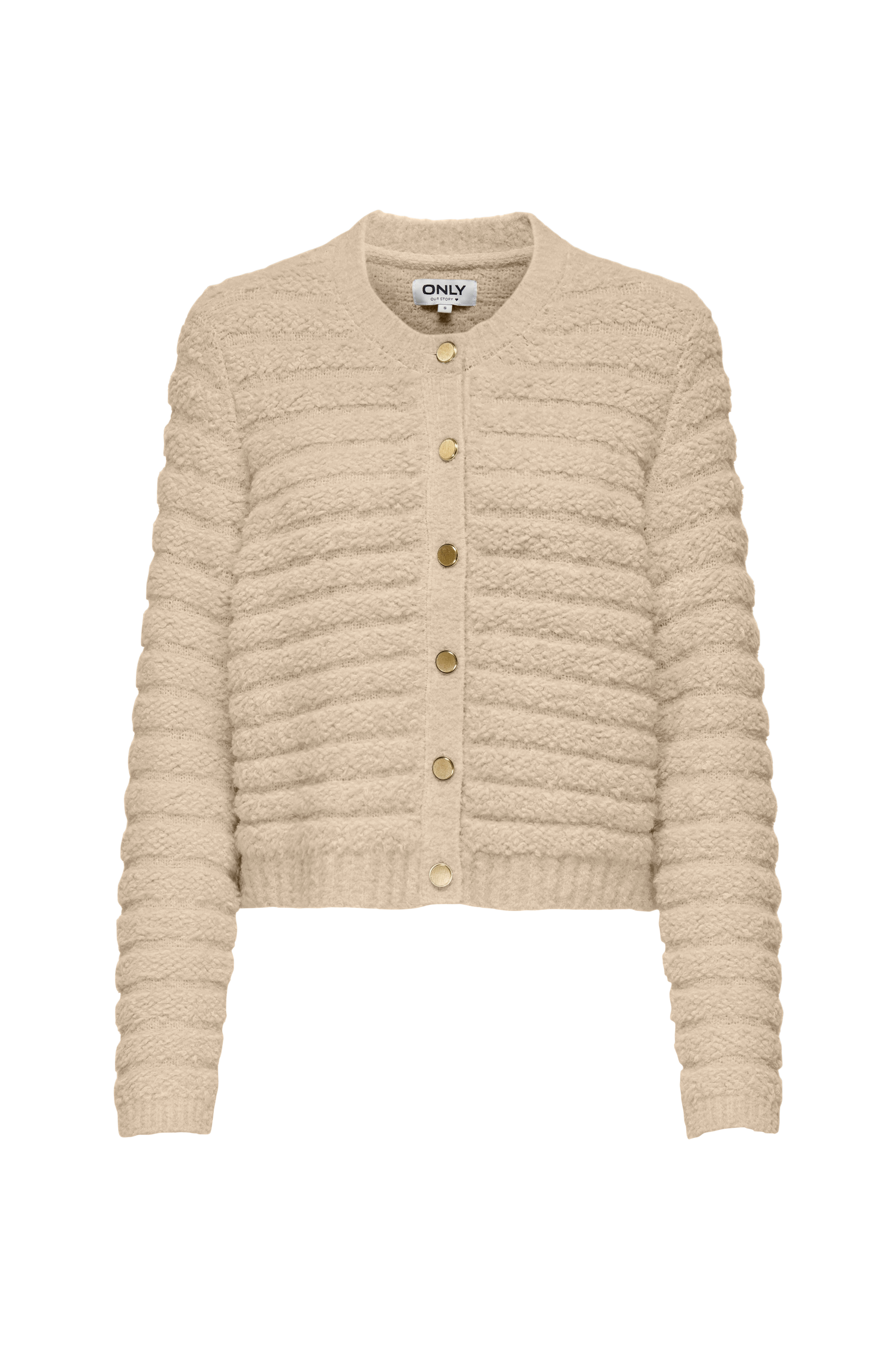 • Fintstrikket cardigan i blødt, elastisk materiale med stribet strukturmønster• Lange arme• Lukning foran med guldfarvede, dekorative knapper• Afrundet halsudskæring• Ribstrik ved manchetterne, nederst og i halsen