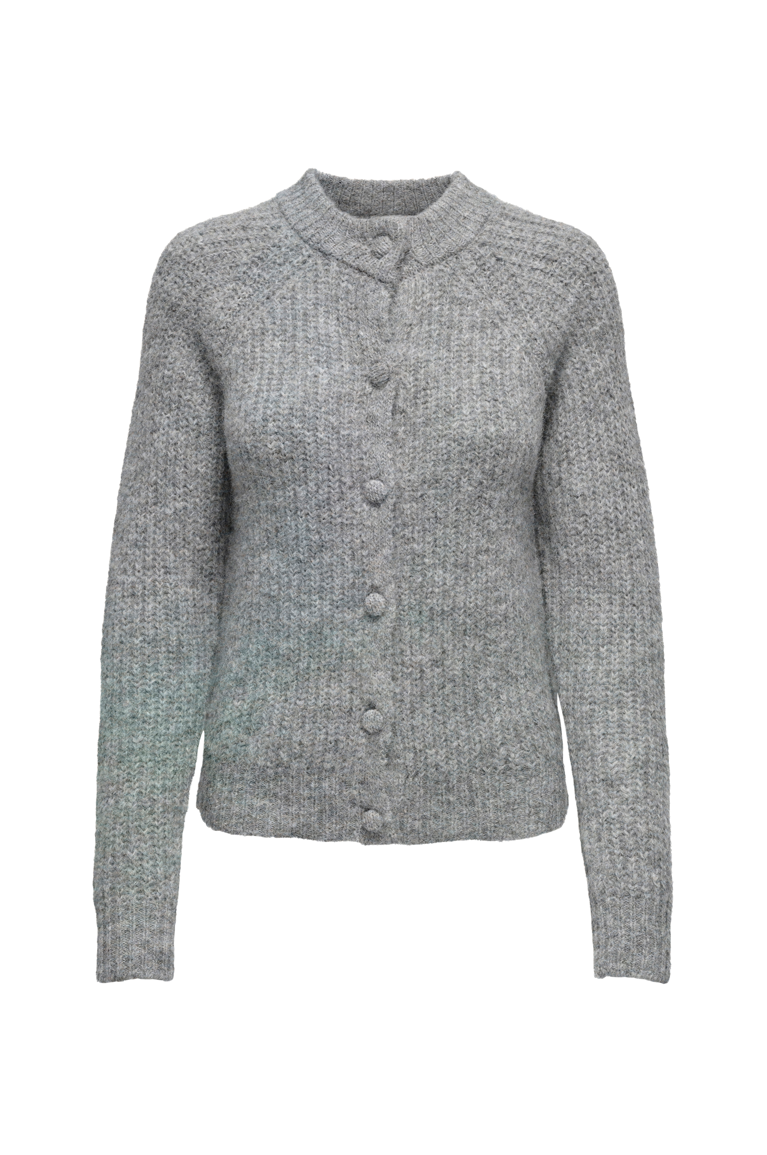 • Ribstrikket model med rund hals• Beklædte knapper hele vejen frem• Langt raglanærme