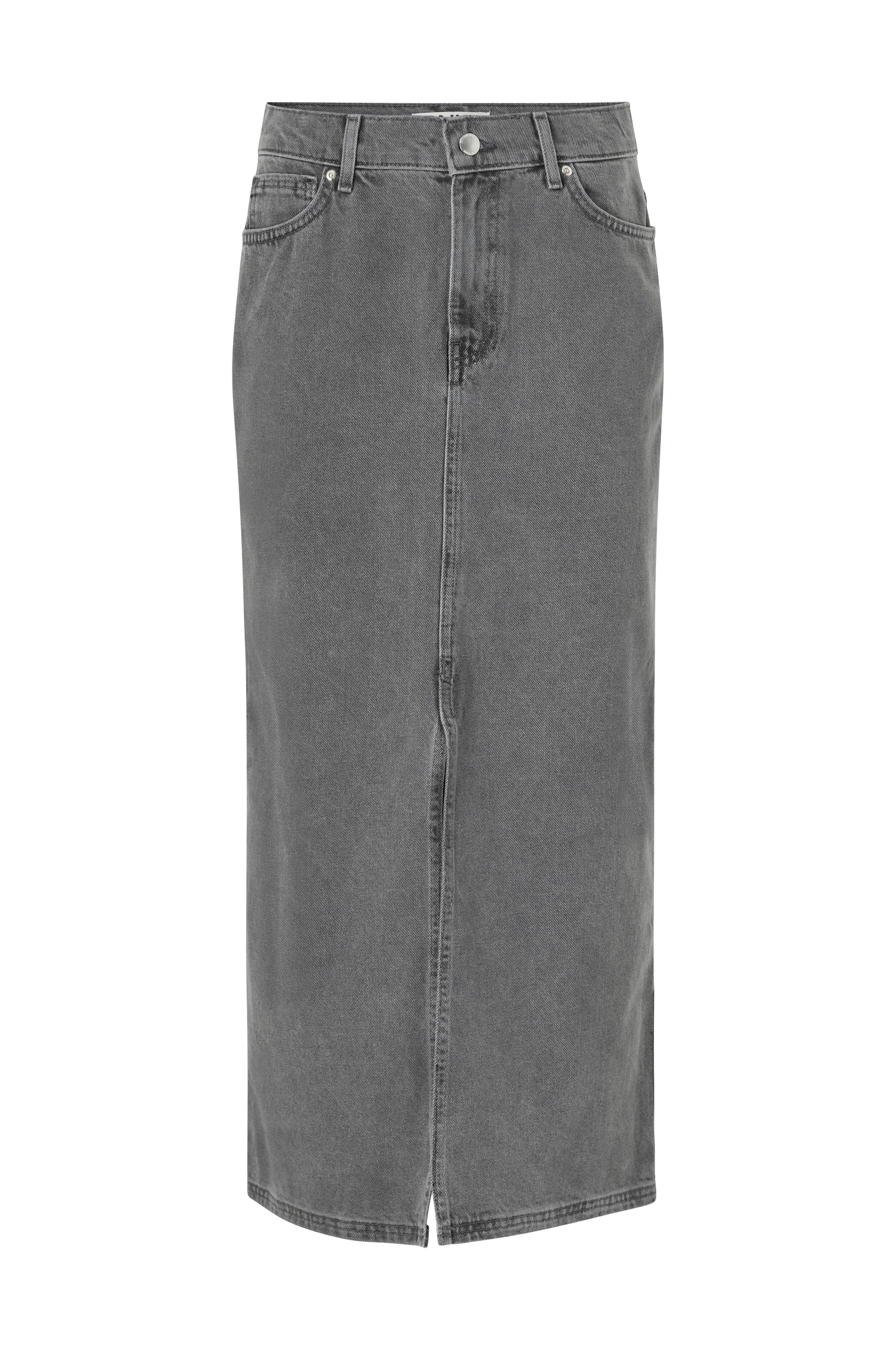 Denimnederdelen har en flot grå farve, sidder godt i størrelse 38, lidt for lang. Det er muligt at forkorte længden lidt, hvis man ønsker det.