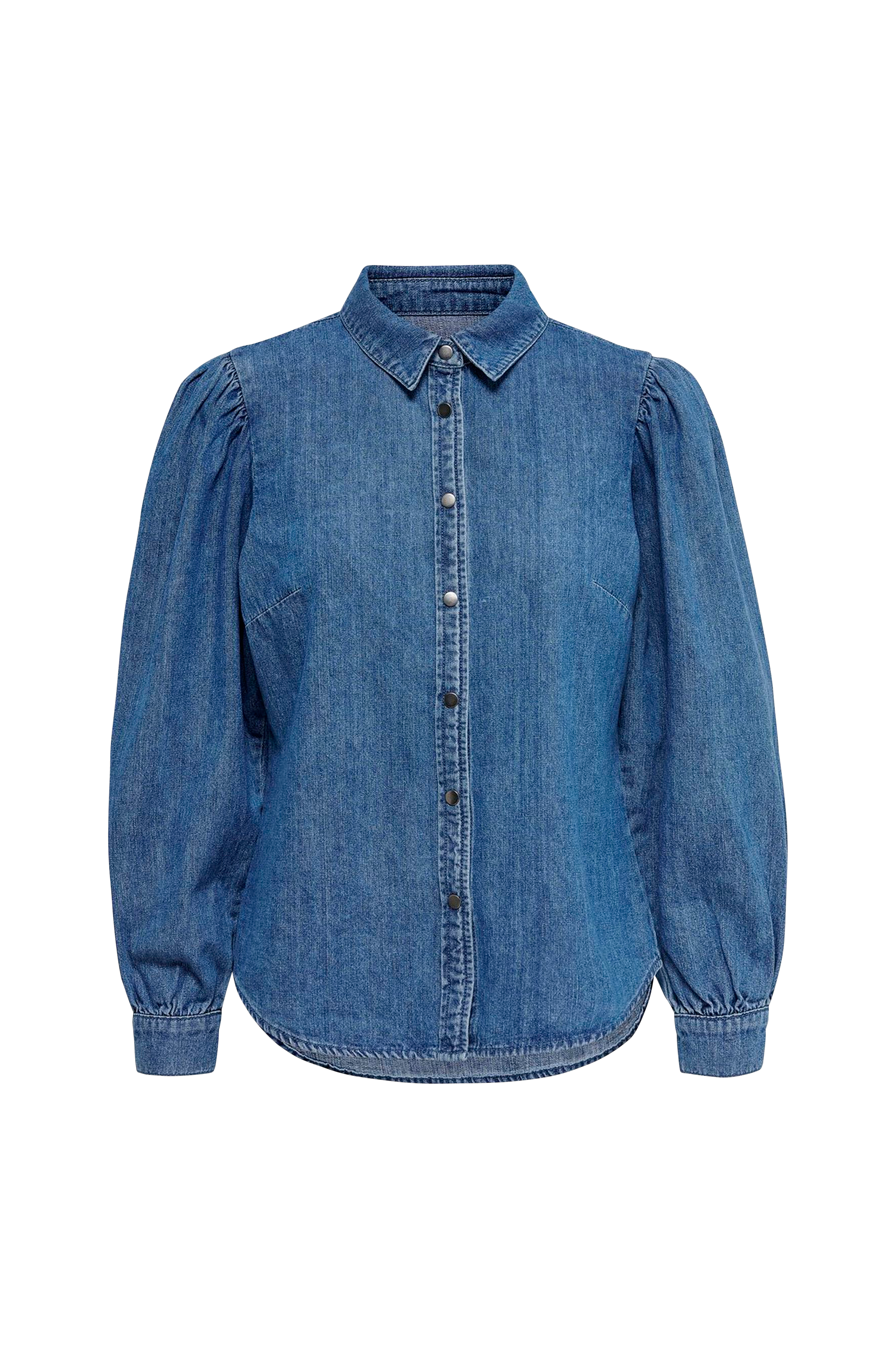 • Hvide trykknapper foran• Lange ballonærmer med manchet• Samling på skuldrene