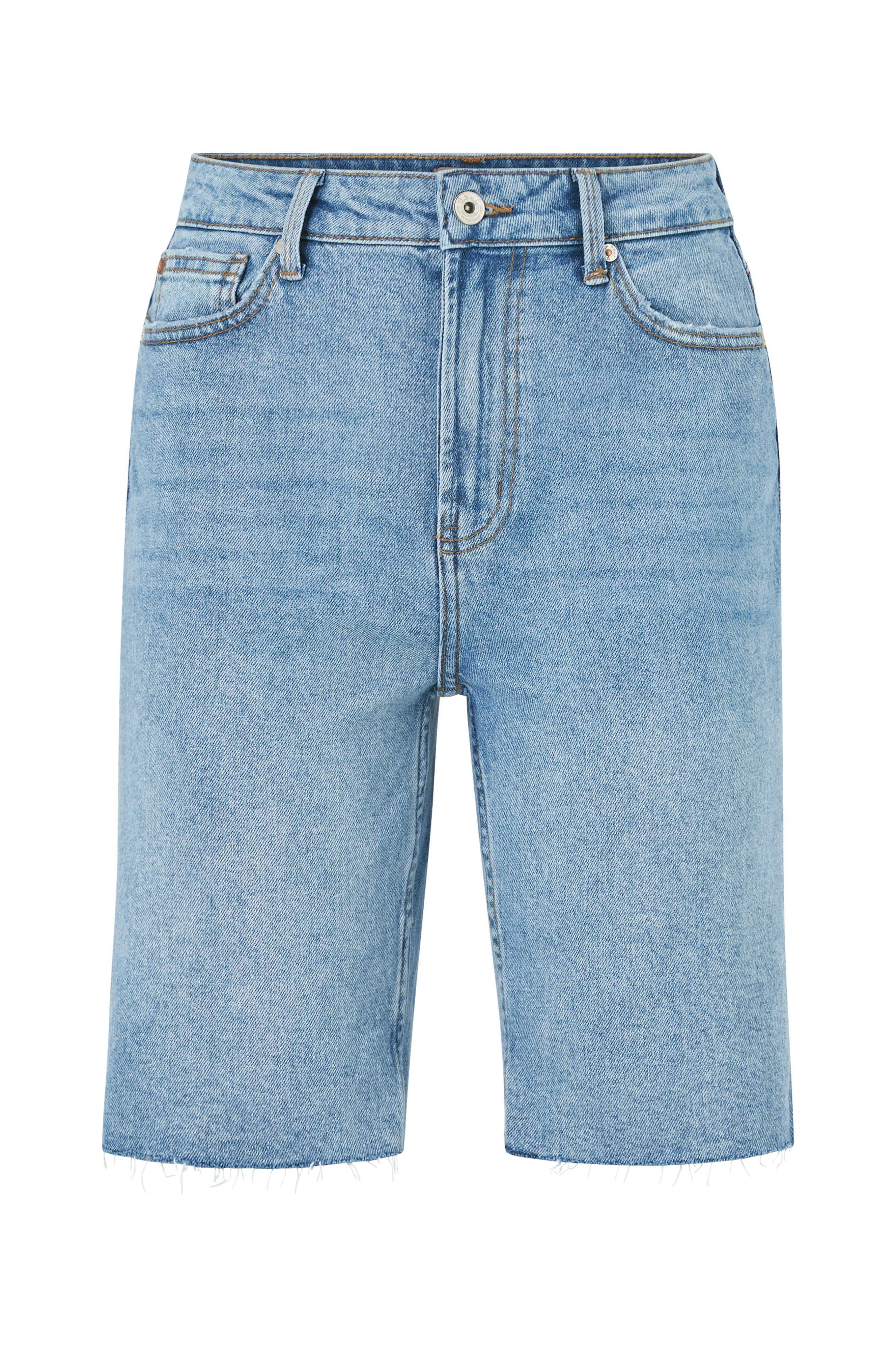 Denimshorts i denim med let stretch. Længere model med høj talje og afklippet, frynset benkant. Fem lommer og lynlåsgylp. Benlængde ca. 24 cm i str. 27.