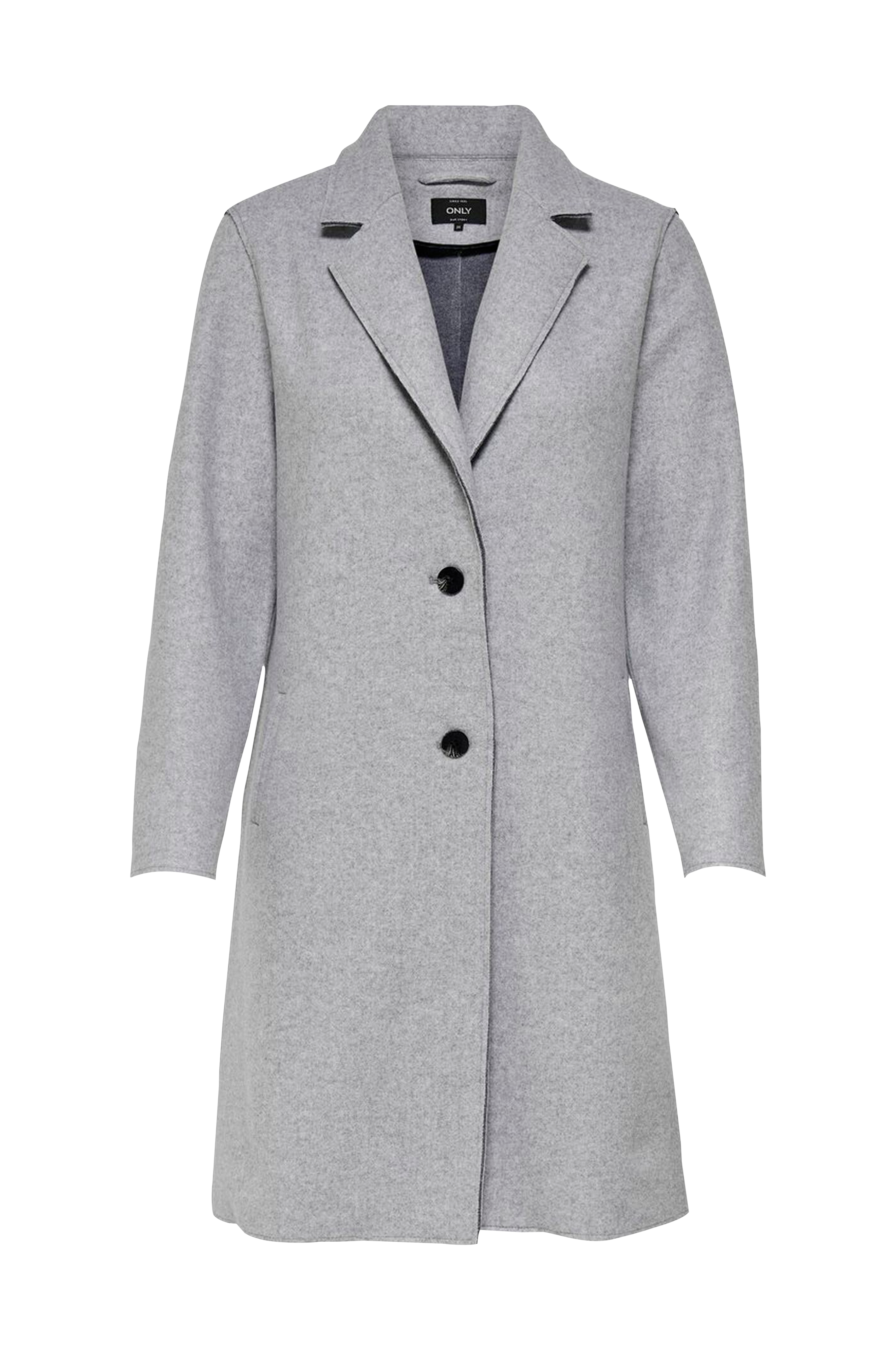 Frakke onlCarrie Bonded Coat fra Only. Lige oversizemodel med krave og revers samt sømme med rå kanter. To knapper foran og to indsatte lommer. Uforet. Længde ca. 90 cm i str. S.