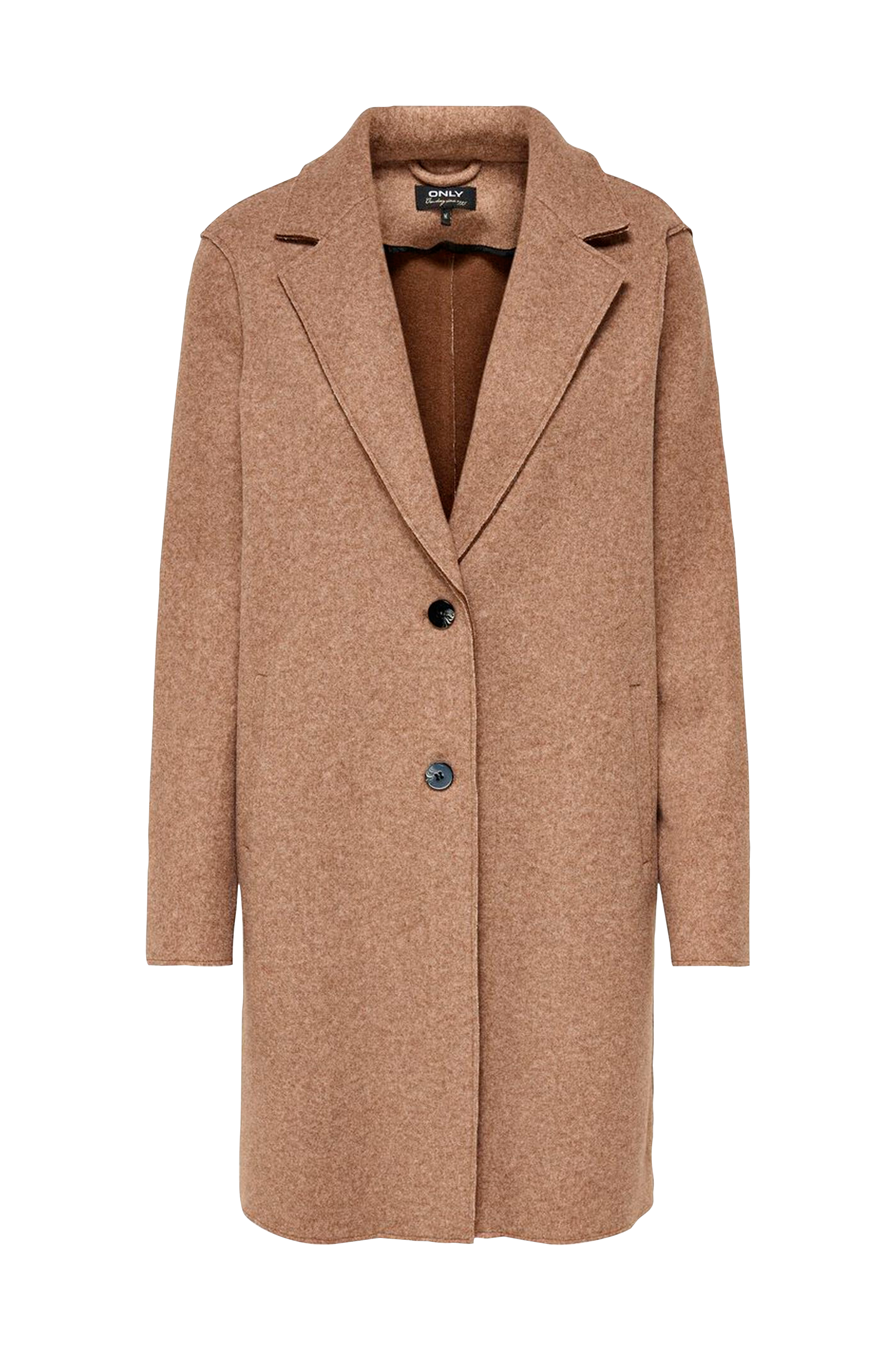 Frakke onlCarrie Bonded Coat fra Only. Lige oversizemodel med krave og revers samt sømme med rå kanter. To knapper foran og to indsatte lommer. Uforet. Længde ca. 90 cm i str. S.