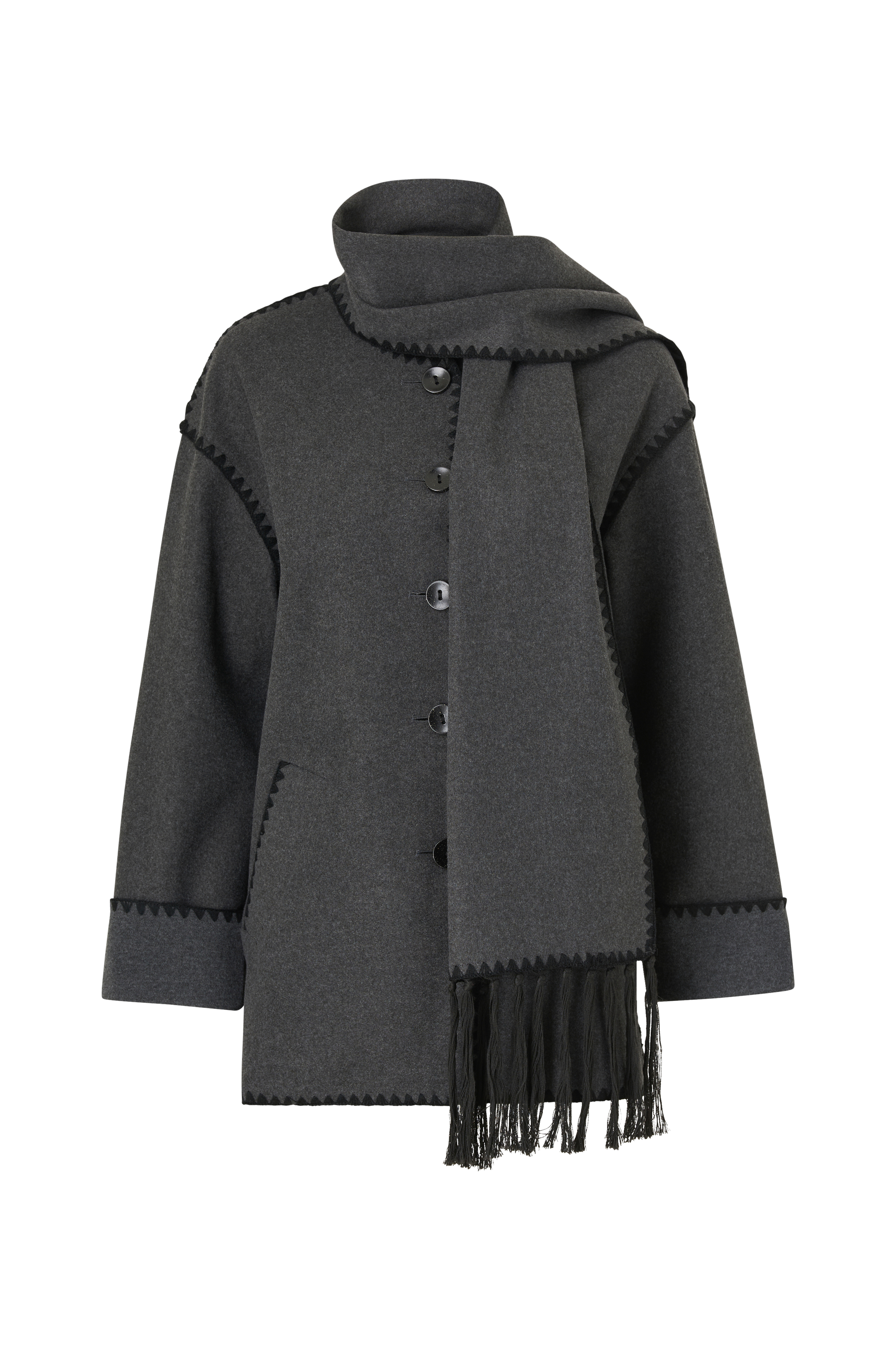 • Filtet frakke med dekorative sømme langs kanterne • Rund halsudskæring • Knaplukning • To lommer • Syede oprullede ved manchetterne • Tørklæde syet på bagsiden af halsudskæringen, der kan draperes på forskellige måder • Tørklædet har lange frynser på de korte sider. • Længde: 77 cm i størrelse S