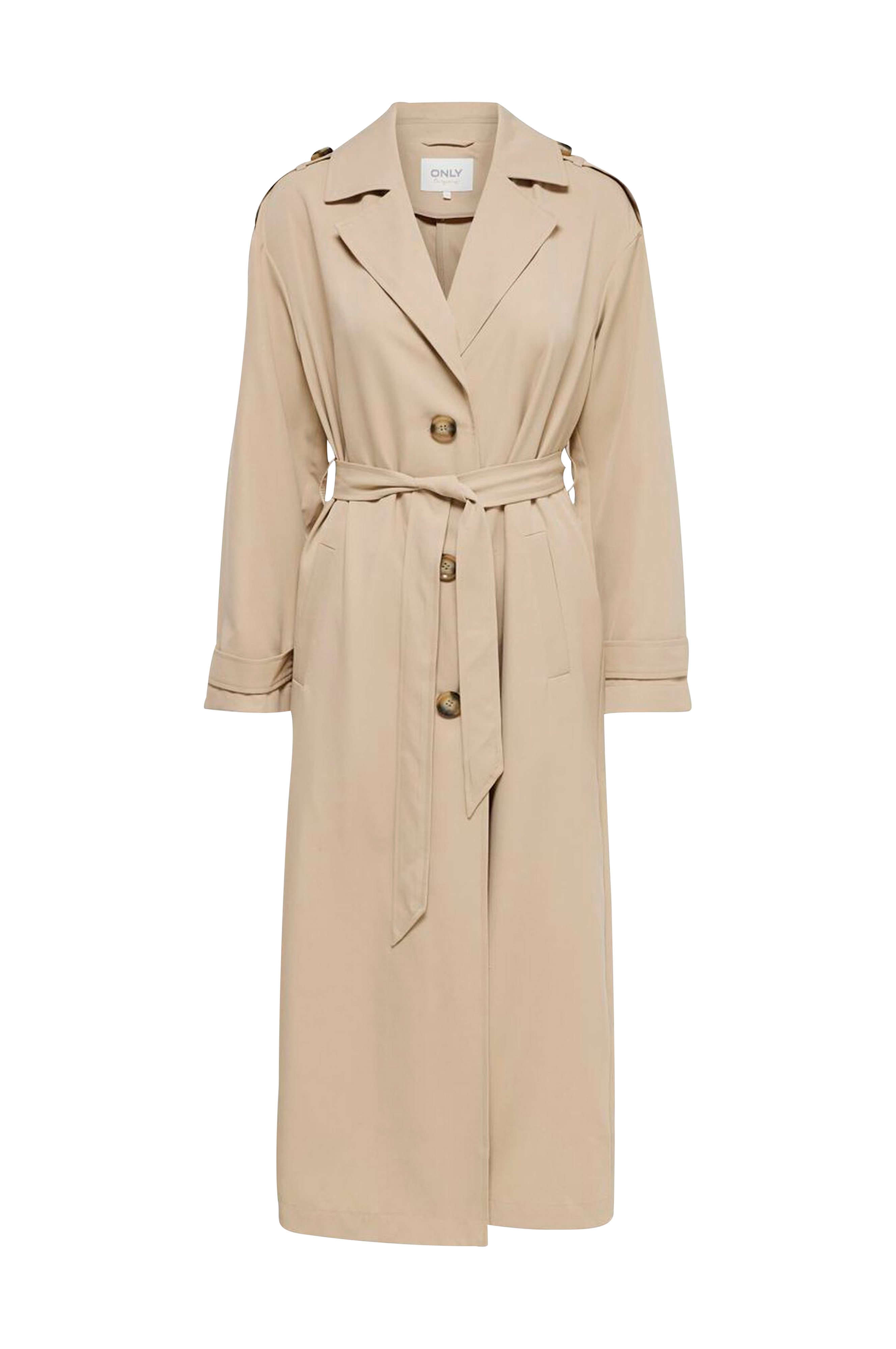 Lang trenchcoat med krave og revers, knapper foran samt to lommer. Bindebælte i taljen og rem og knap på skuldrene og i ærmekanterne. Slids i kanten forneden bagpå. I vævet kvalitet. Uforet. Længde ca. 123 cm i str. S.