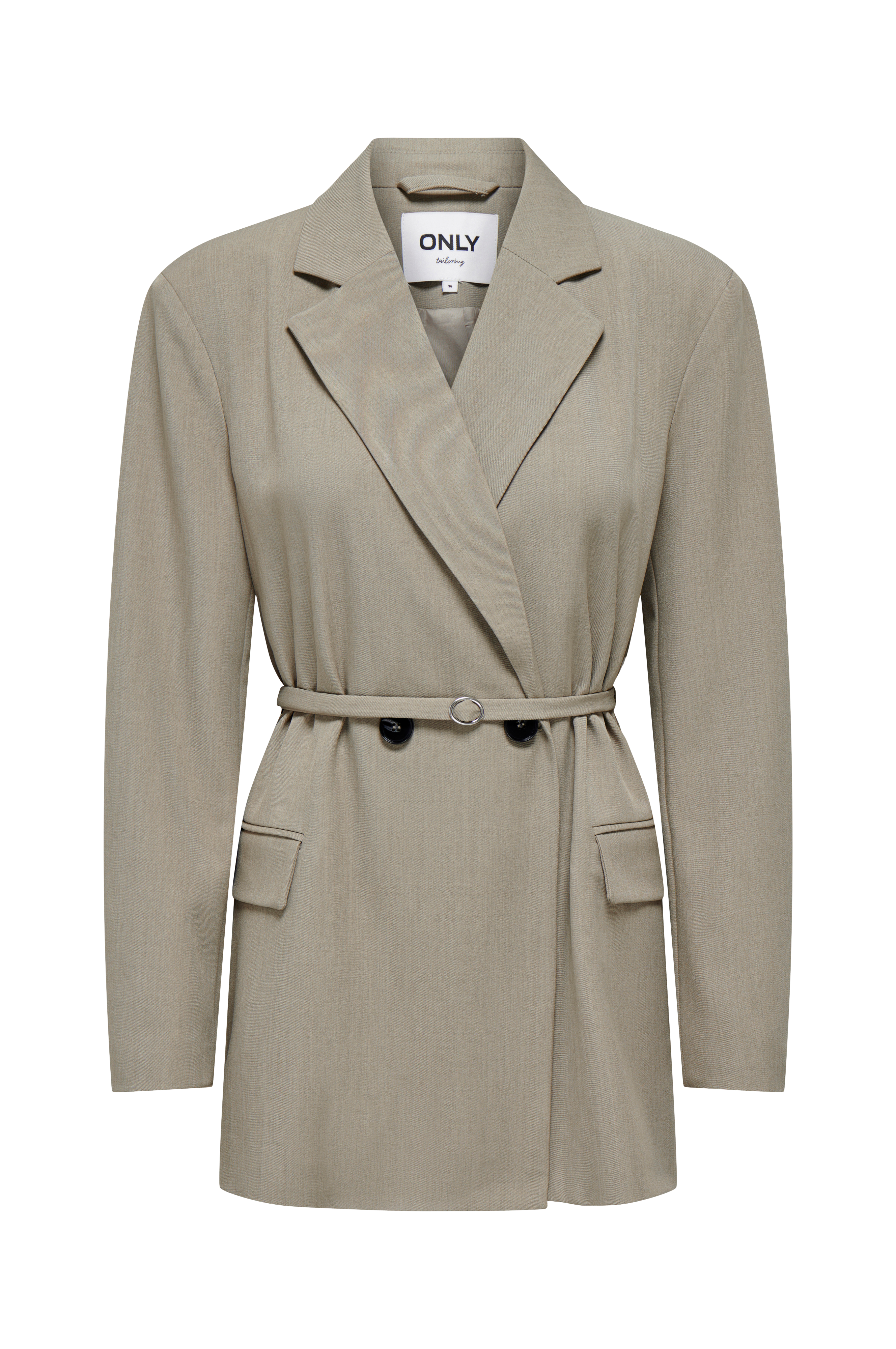 • Lidt længere model• Dobbelt knaplukning• Tyndt bælte i tekstil• To lommer• Slids bagpå• Vævet for