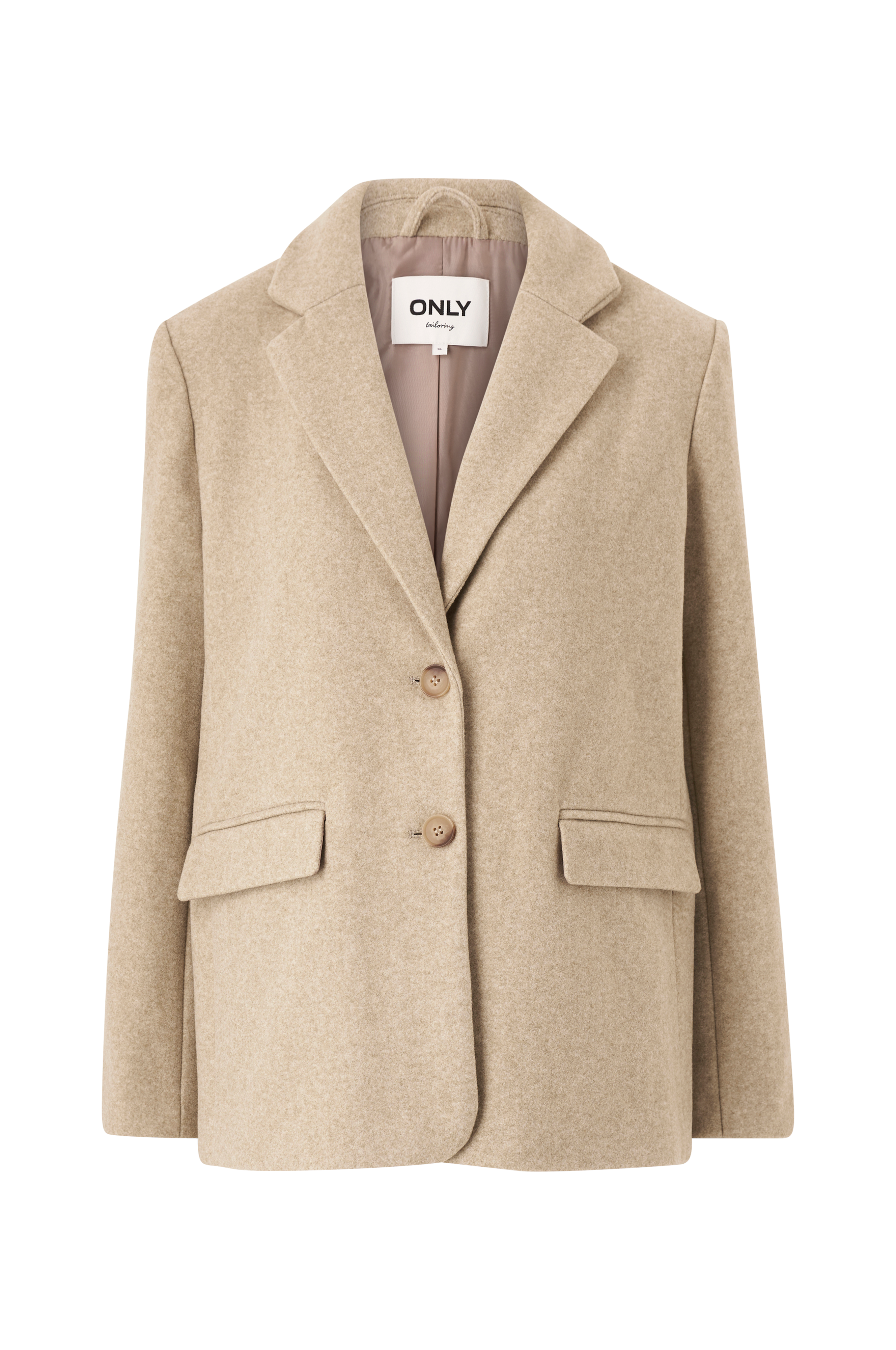Jakke i blazermodel med knapper og to lommer foran. Dekorative knapper i ærmekant og slids forneden bagpå. Vævet for. Længde ca. 72 cm i str. 36.