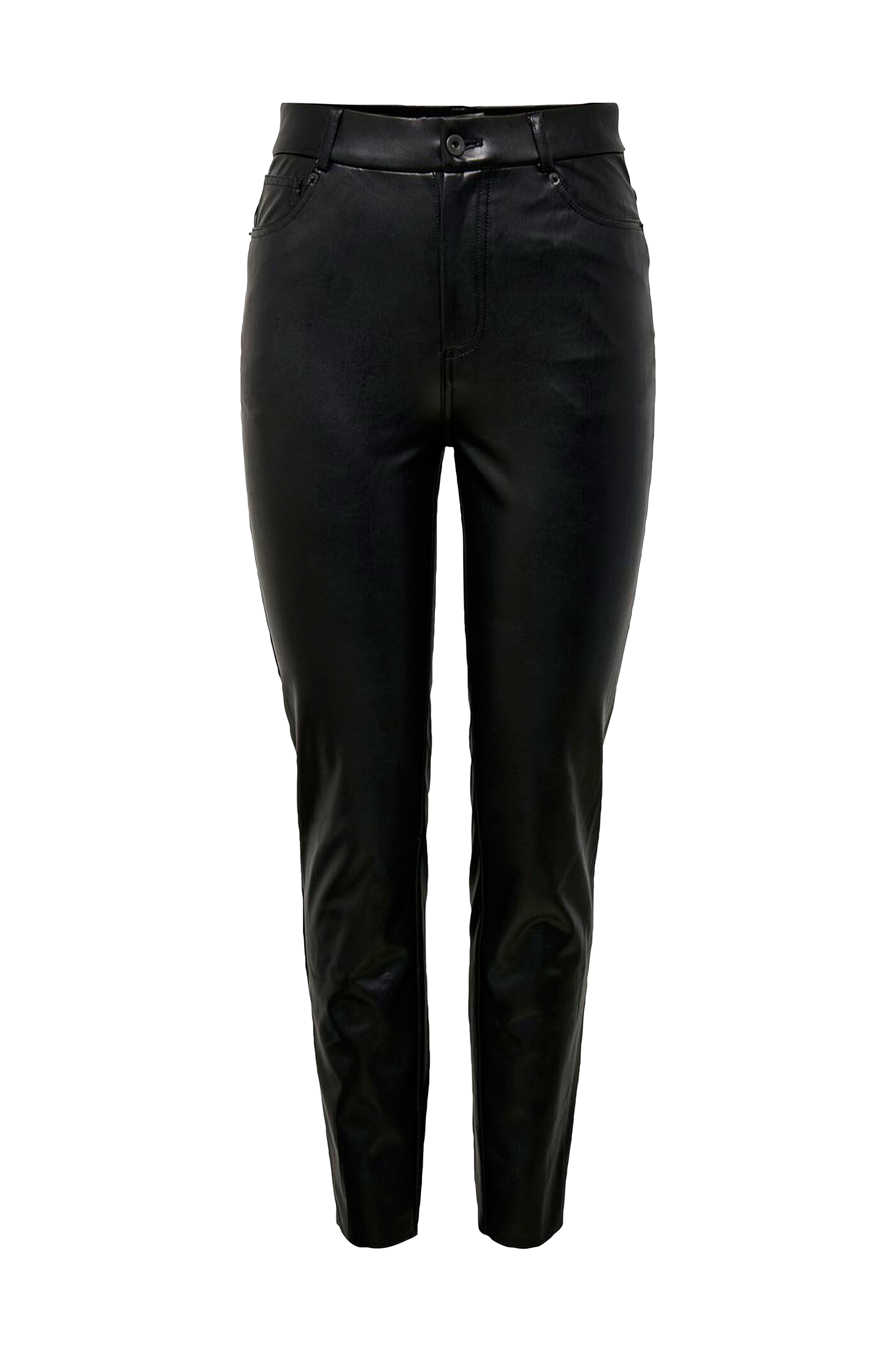 Jeans onlEmily HW ST Ank Faux Leather Pant fra Only. Model i imiteret skind med høj talje og lige ben som slutter på læggen. Linning med stropper og lynlås i gylpen samt tre lommer foran og to lommer bagpå. Indvendig benlængde ca. 70 cm i str. S.
