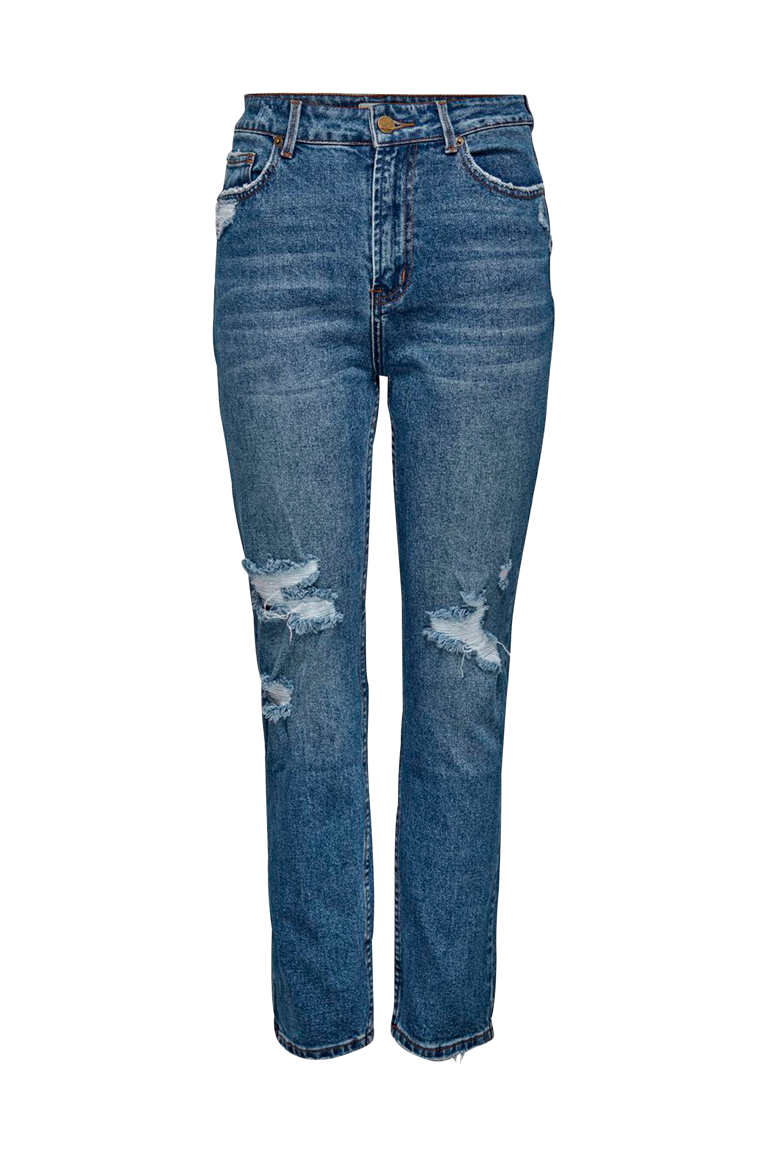 Emily jeans med høj talje og ankellange ben. I denim med grove slidte effekter både foran og bagpå. Lige model med fem lommer og lynlåsgylp.