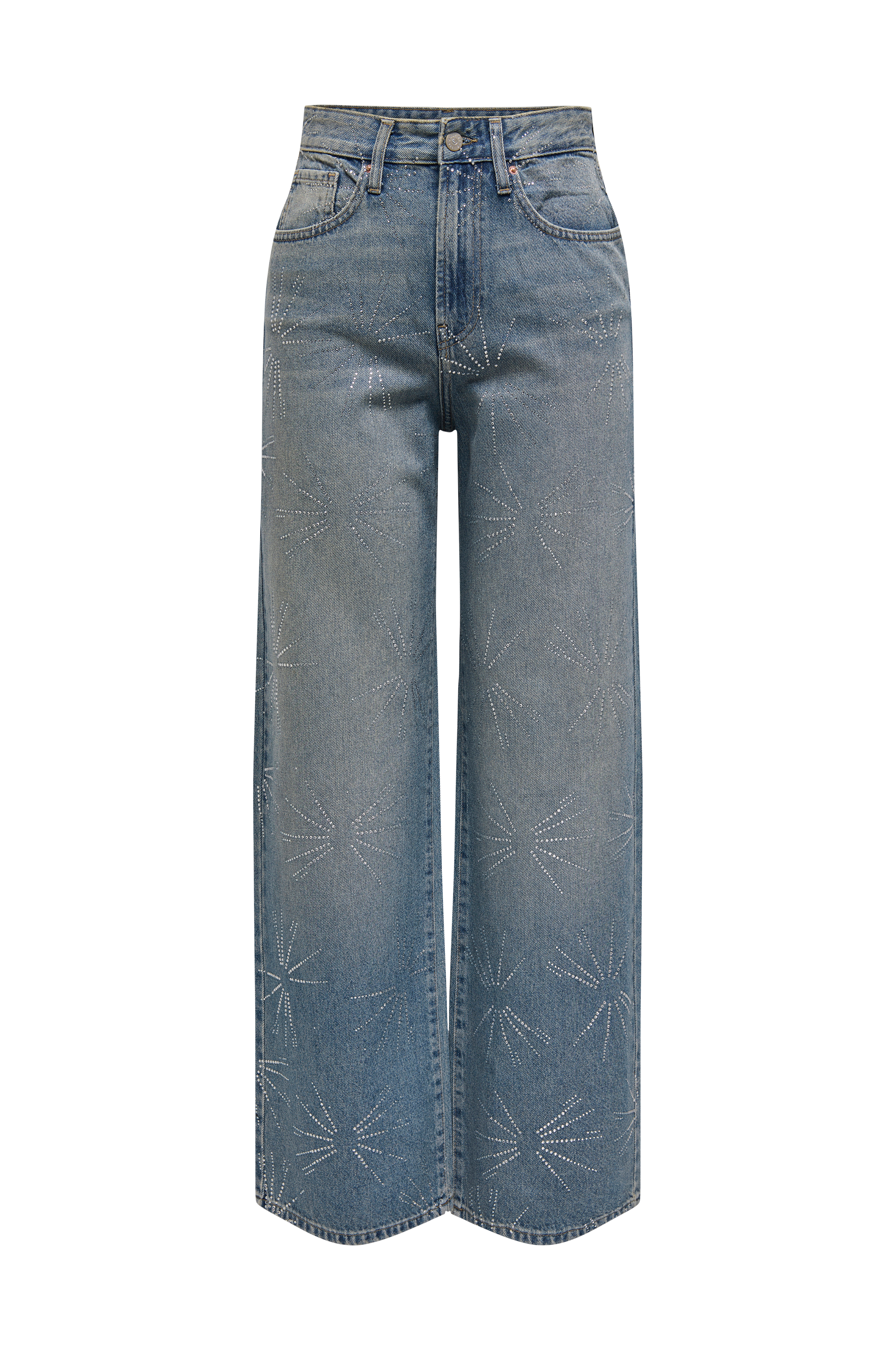 • Jeans i bomuld med rhinstensudsmykning• Høj talje med bælteløkke• Lukning med knap og gylp med lynlås• Brede bukseben• Femlommemodel