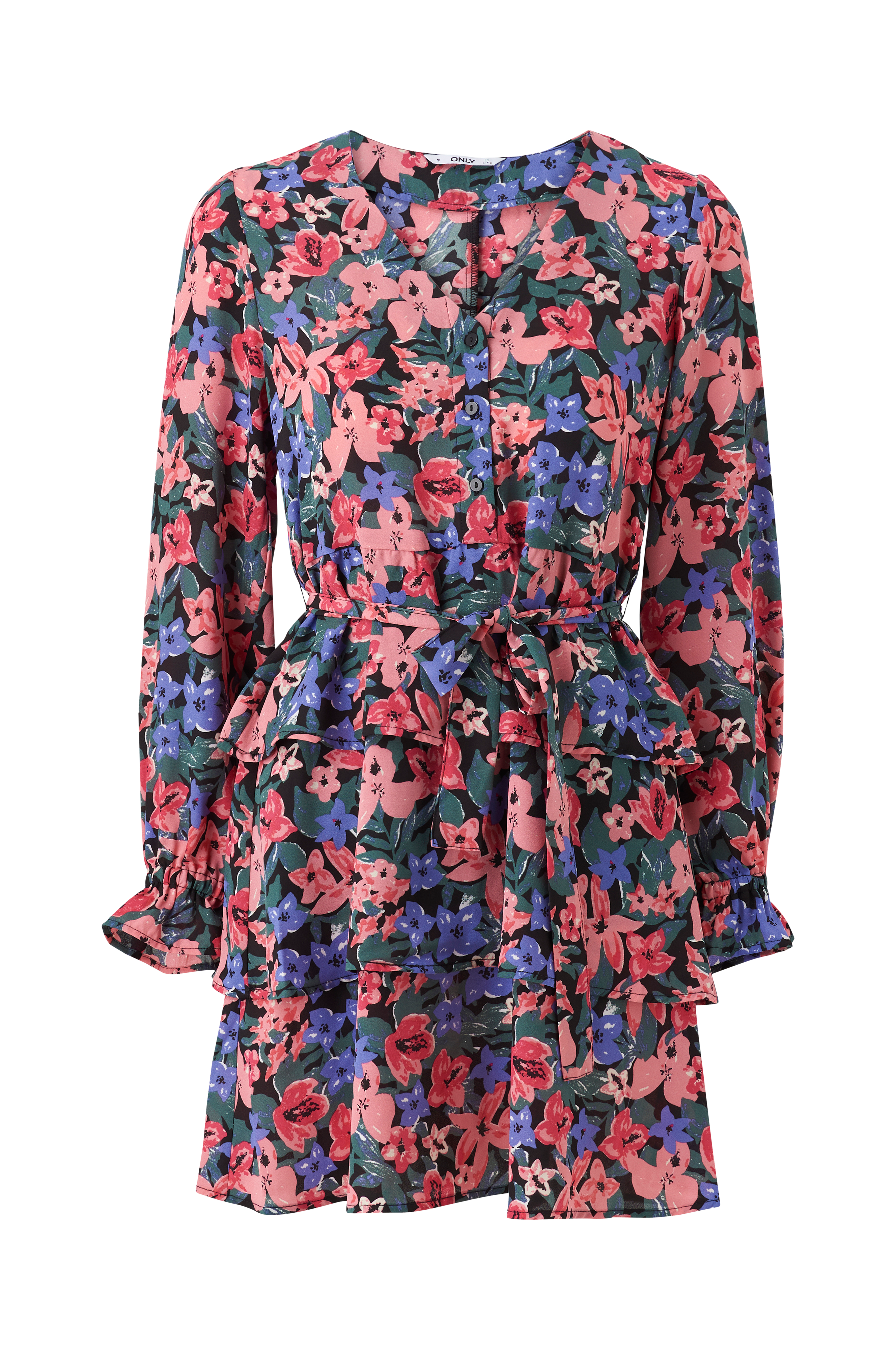 • Model med svaj• Brede volanter på skørtet• V-formet halsudskæring• Kort knaplukning foran• Langt, bredt ærme med elastisk bånd nederst• Bæltespænde ved taljen• Længde: 86 cm i størrelse S