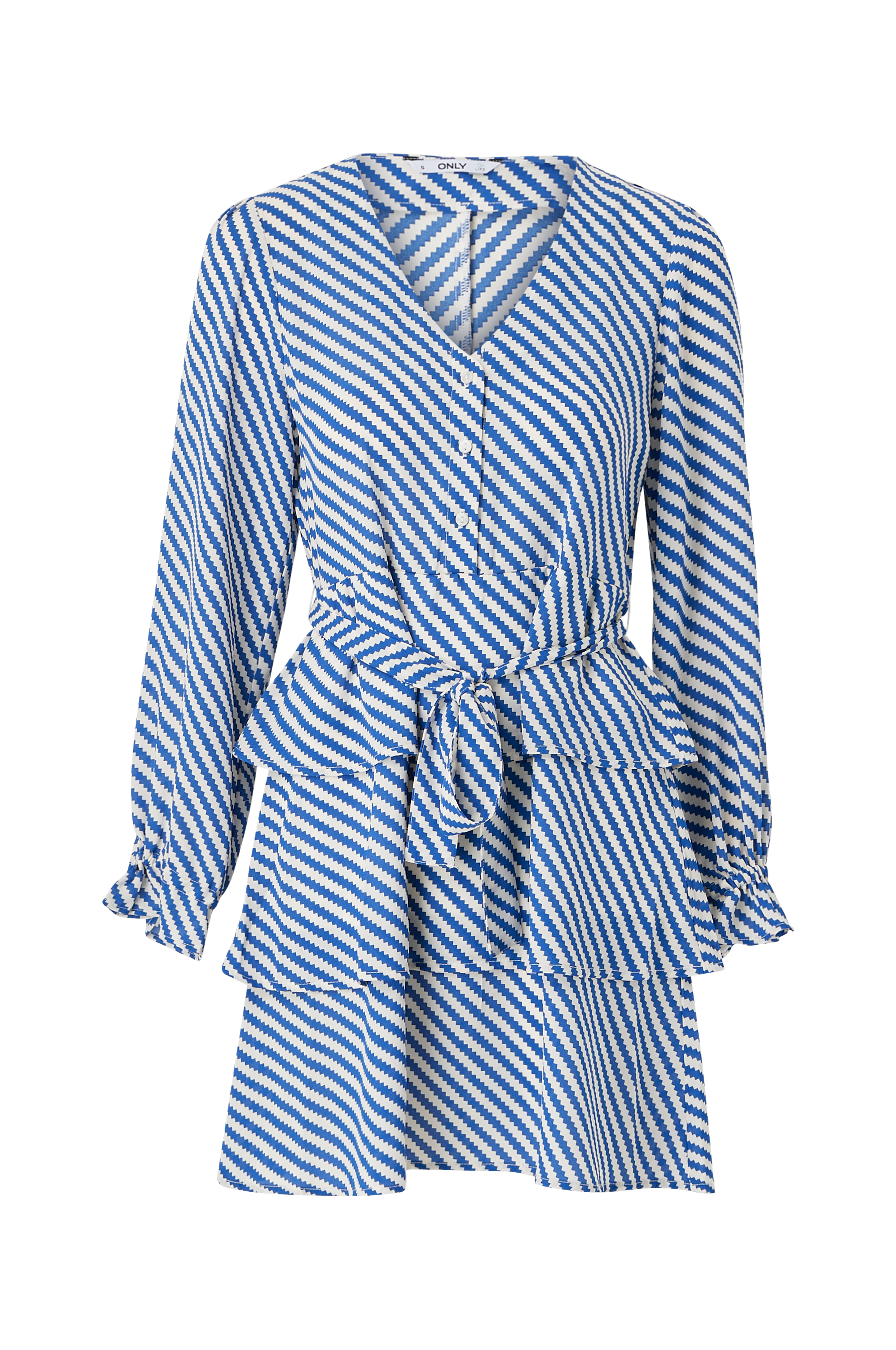 • Model med svaj• Brede volanter på skørtet• V-formet halsudskæring• Kort knaplukning foran• Langt, bredt ærme med elastisk bånd nederst• Bæltespænde ved taljen• Længde: 86 cm i størrelse S