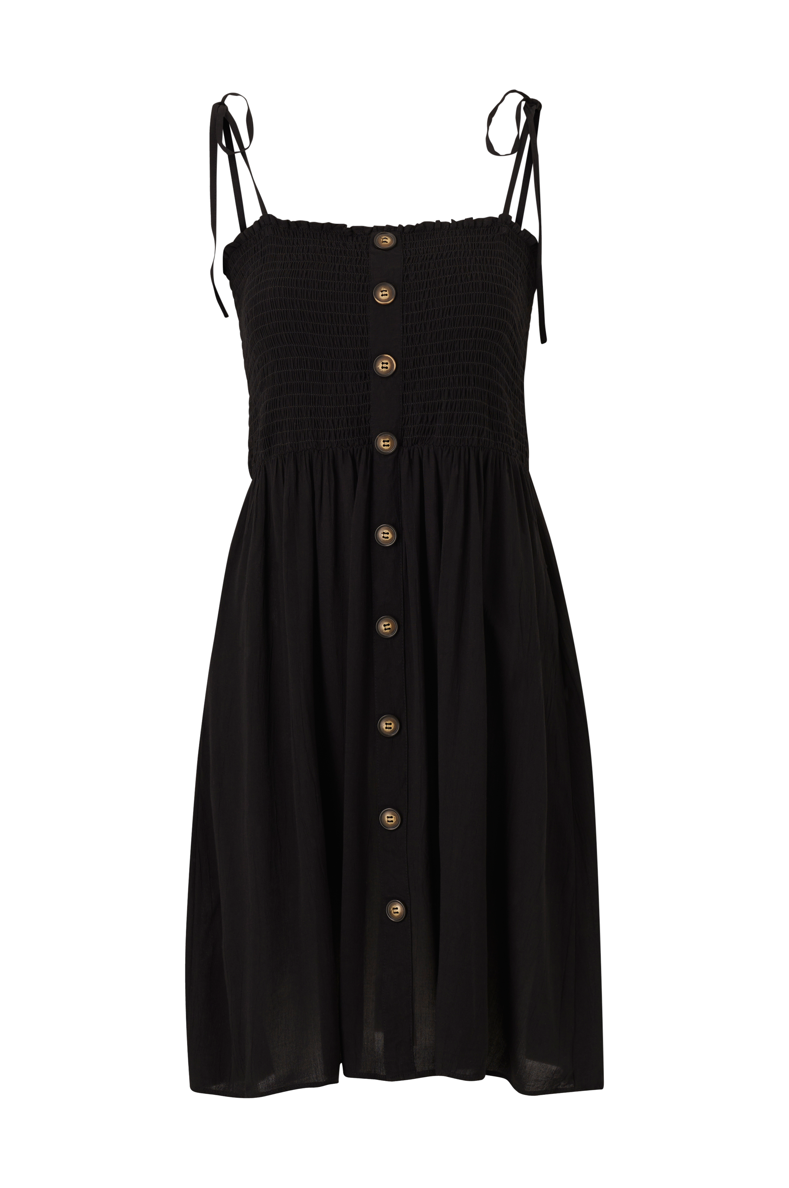 • Ærmeløs kjole • Skulderstrop med bindbart bånd • Smocket øvre del • Dekorationsknapper foran • Længde: 95 cm i størrelse 36 • Produktet indeholder viskose fra Livaeco by Birla Cellulose™, en syntetisk cellulosefiber af træmasse der kommer fra kontrolleret og ansvarsfuldt skovbrug.