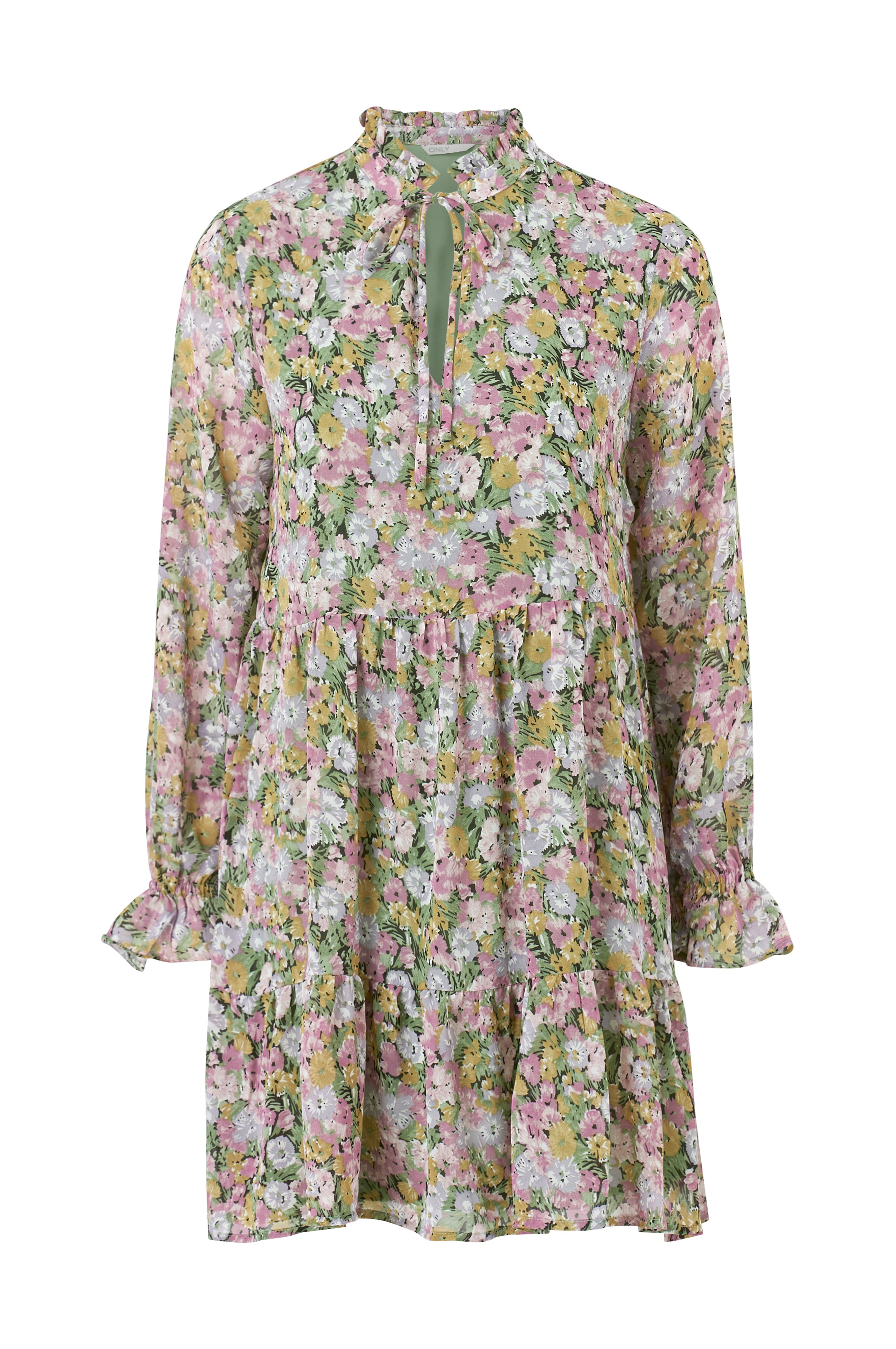 Blomstret kjole i tynd, vævet kvalitet. Ruchekant i halsudskæring med v-åbning og bindebånd foran. A-formet nederdel med flæse forneden og lange ærmer med elastik og flæse i ærmekant. Foret i jersey. Længde ca. 87 cm i str. S.