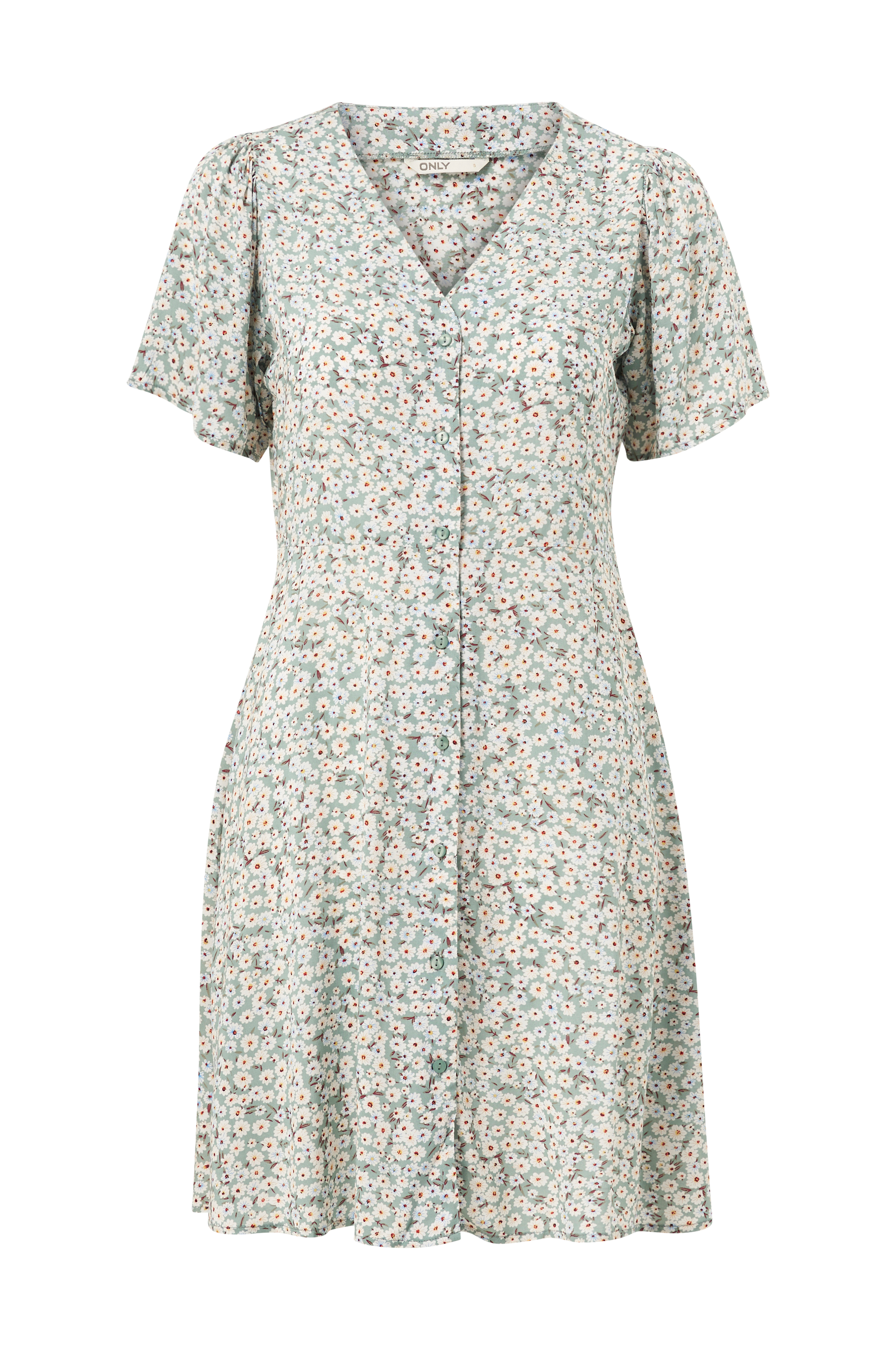 • Kjole i viskose• V-formet halsudskæring• Gennemknappet model• Kort ærme• Tynde bindebånd ved taljen• Længde: 91 cm i størrelse S
