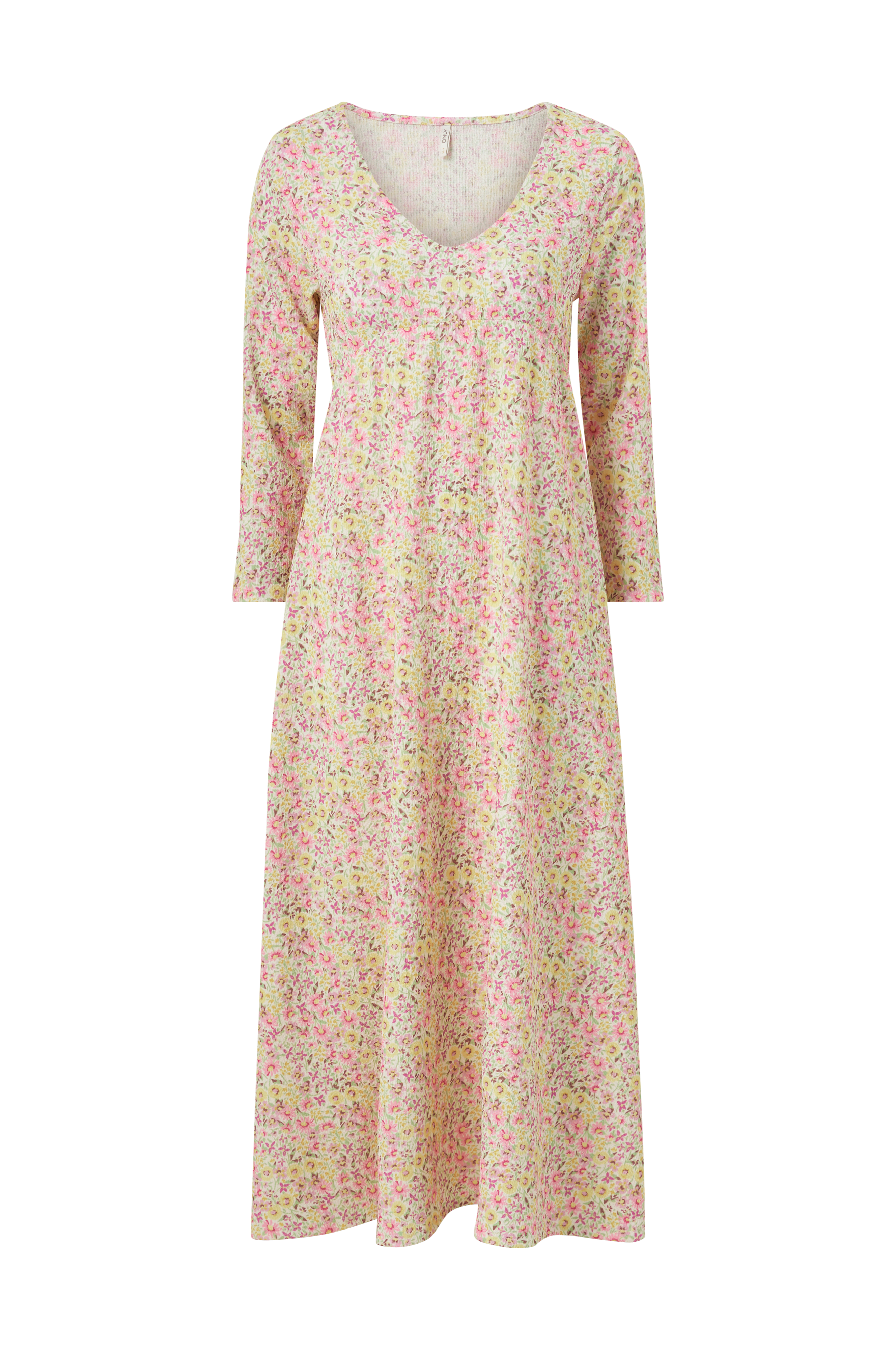 • V-udskæring• Samling under brystet• Elastisk bånd bagpå ved taljen• Strækkvalitet• Længde: 125 cm i størrelse S