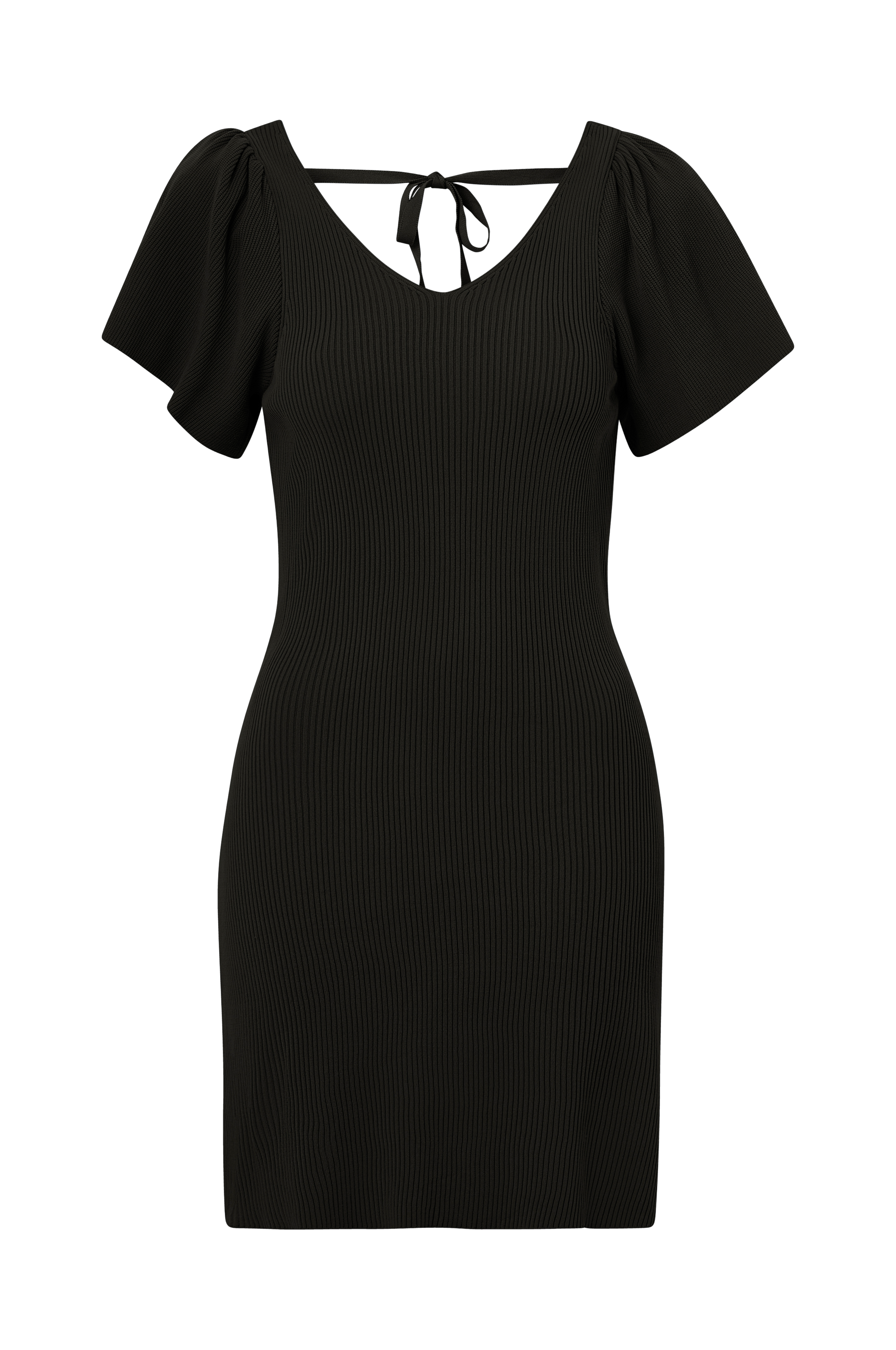 • Kort, figursyet kjole i ribbet jersey• V-udskæring foran og bagpå• Korte flagrende ærmer• Længde: 90 cm i størrelse S