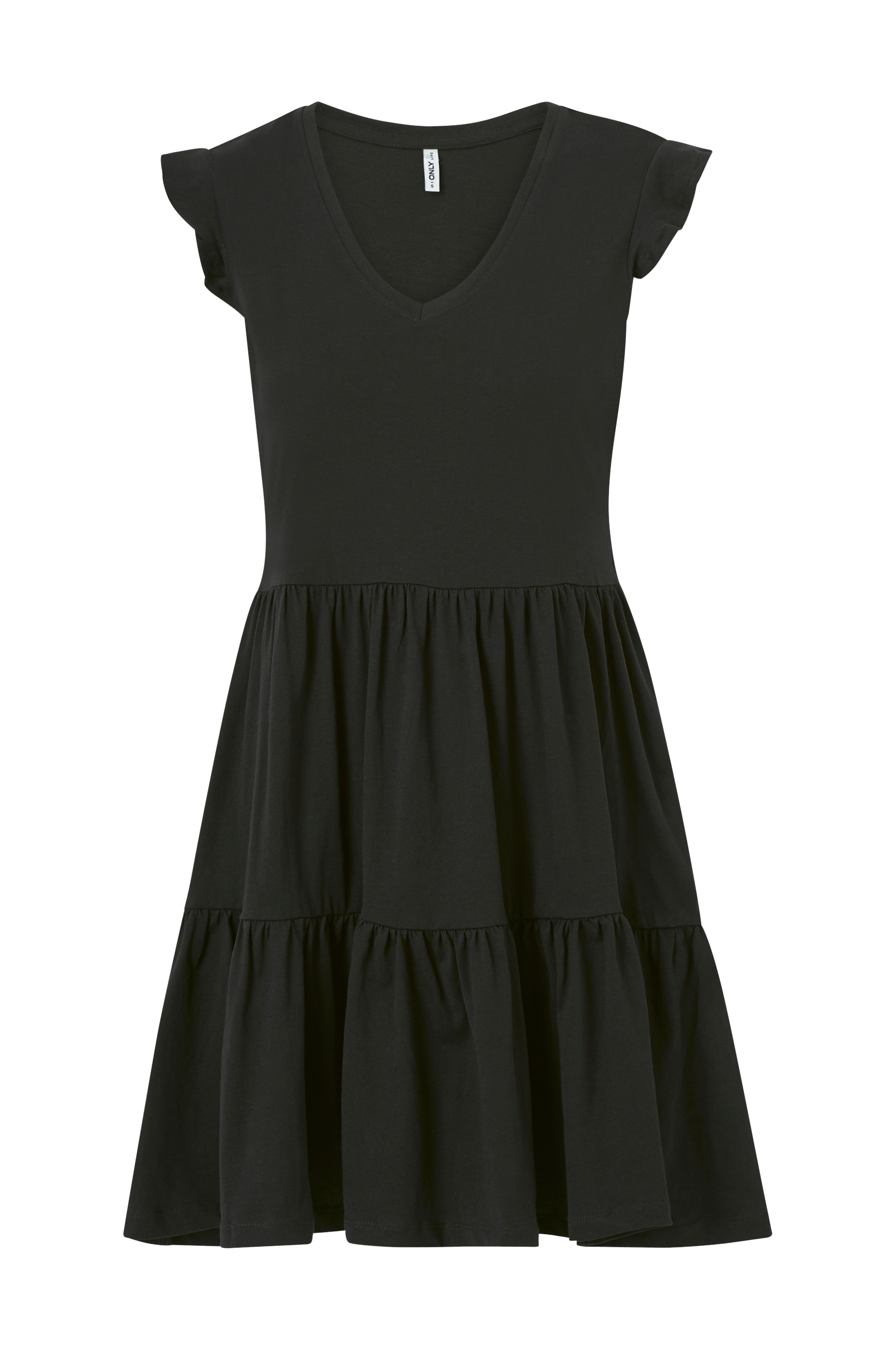 Kjole i bomuldsjersey med V-udskæring foran og korte flæseærmer. A-formet nederdel. Længde ca. 90 cm i str. S.