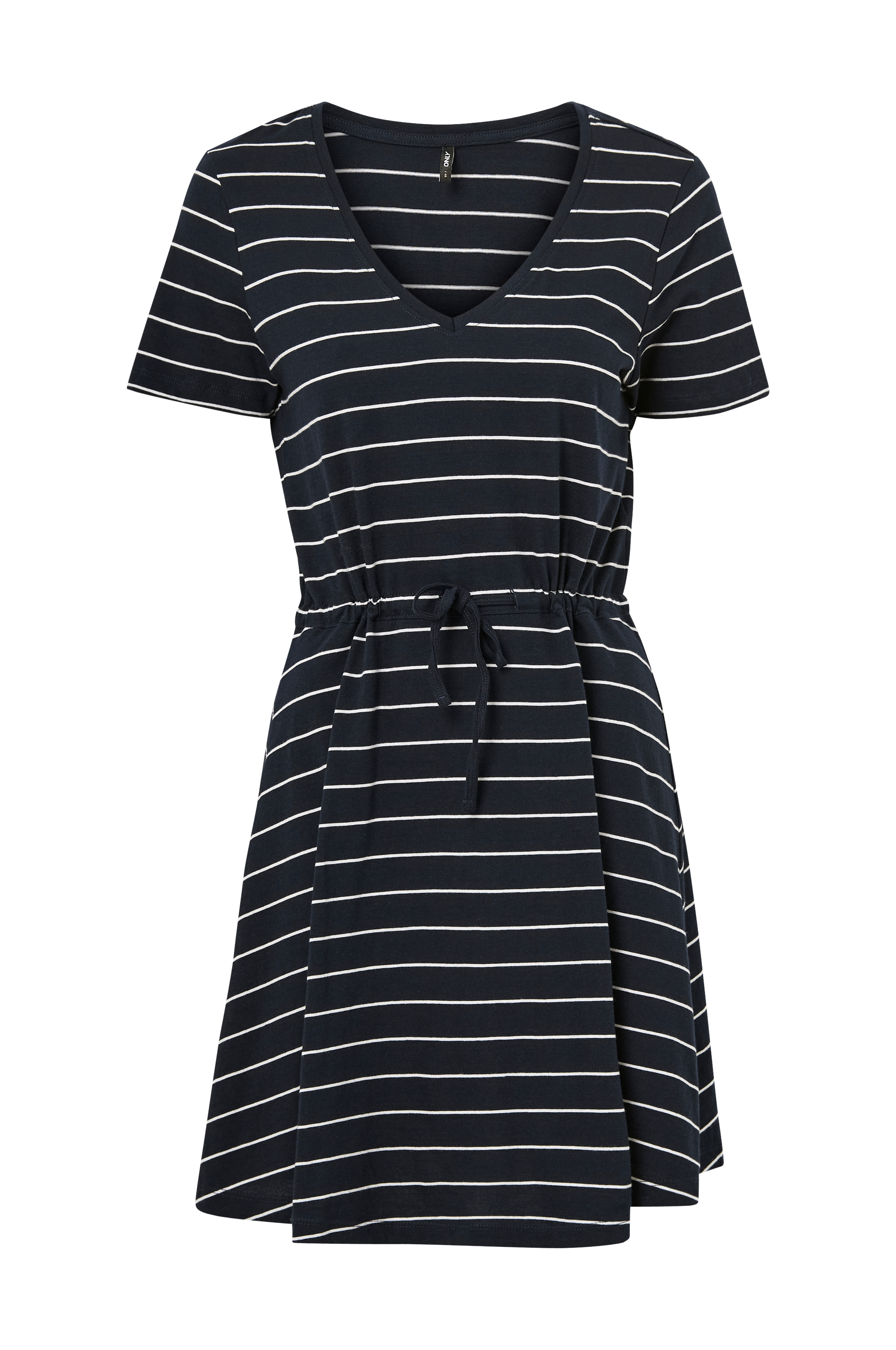 • Kjole i bomuldsjersey• V-udskæring• Korte ærmer• Træksnørre ved taljen• Længde: 90 cm i størrelse S
